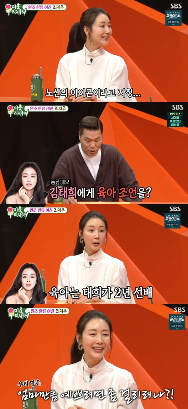 미우새최지우/사진=SBS캡처[스포츠투데이임시령기자]'미운우리새끼'최지우가배우김태희가육아선배라고밝혔다.25일방송된SBS예능'미운우리새끼'에서는배우최지우가게스트로출연했다.이날최지우는출산후3년만에복귀작으로영화'슈가'개봉을앞두고있다.이에'미우새'출연진들이최지우에게"노산의아이콘"이라고말했다.46세에첫아이를얻은최지우는김태희로부터육아조언을받는다고.그는"정말도움을많이받는다.(아이)발레학원을같이보내기도하고,육아는김태희가2년선배엄마다.'우리아기한테너무작아'하는옷은저한테주기도한다"고얘기했다.최지우는딸예쁘냐는잘문을받자"당연히제눈에는"이라면서"우리딸은엄마만큼예쁘려면좀더두고봐야하지않을까"라고너스레를떨었다.[스포츠투데이임시령기자[email protected]]Copyright©스포츠투데이.무단전재및재배포금지.