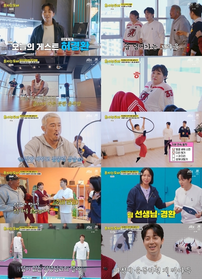 사진=JTBC‘혼자는못해’사진=JTBC‘혼자는못해’[뉴스엔박양수기자]‘혼자는못해’가허경환과함께이색운동투어를즐기며유쾌한웃음을선사했다.지난27일(화)방송된JTBC‘혼자는못해’(연출홍상훈,권예솔)에서는추성훈,전현무,이수지,이세희가예능대세허경환과함께애니멀플로우,에어리얼후프,피클볼등이색운동들을경험하며시청자들의건강한화요일을책임졌다.이에힘입어2049수도권타겟시청률0.6%를기록하며동시간대1위에올랐다.(닐슨코리아유료가구기준)이날허경환은소문난운동광답게네MC를신개념운동의세계로자연스럽게이끌었다.8년간갈고닦은주짓수실력을뽐내는한편,추성훈과한판승부를벌이며‘브라운테크닉’을자랑해모두를감탄하게만들었다.가볍게워밍업을마친다섯사람은인간몸의본능을깨우는애니멀플로우운동체험으로이색운동투어의포문을열었다.선생님의가르침에따라사바나를누비는야생동물처럼편안하게근육을푸는허경환,추성훈과달리어딘지모르게엉성한전현무와이수지의자세는추성훈과허경환을폭소하게했다.시행착오를겪으며애니멀플로우의기본자세들을습득한허경환과MC들은내친김에고난도연결동작에도전했다.특히허경환과전현무,이수지는동작을하는내내티격태격하면서도연결동작까지완벽하게성공하며환상의호흡을발휘했다.애니멀플로우운동을통해굳어있는근육을쭉편허경환과네MC는영화‘케이팝데몬헌터스’속주인공이하던운동인에어리얼후프체험에돌입했다.마치서커스의한장면을보는듯한선생님의아름다운시범동작과이를똑같이따라하는이세희의탁월한운동신경이모두의탄성을자아냈다.반면추성훈,전현무,이수지와허경환은예상과다르게흘러가는몸짓에비명을질러현장을초토화시켰다.후프에올라탄이들이중력으로인해영좋지못한곳(?)에타격을느낀것.후프에매달린MC들의버둥거림은보는이들을배꼽잡게했다.이색운동투어의마지막코스는‘트민남(트렌드에민감한남자의줄임말)’전현무가강력추천한셀럽스포츠피클볼이었다.최근피클볼에푹빠져있다던전현무는이전과다른위풍당당한미소를띠며멤버들을체육관안으로안내했다.이어선생님의지시로일일보조코치에임명,패들과공을능숙하게다루며경력자의위엄을드러냈다.테니스와탁구,배드민턴을접목한신개념스포츠에멤버들이흥미를표했고곧허경환,이수지팀과추성훈,이세희팀의즉석대결도성사됐다.추성훈과이세희가찰떡팀워크로점수를내는사이이수지는헛스윙을연발하며허경환을환장하게했다.대결내내이수지의이름을부르다결국패배의쓴맛을본허경환은선생님과한팀을이뤄설욕전에나섰다.선생님과붙고싶다며승부욕을발산한‘추무듀오’추성훈과전현무가도전장을내밀었다.그러나자신만만한태도와달리선생님의스매싱한번에추성훈과전현무는힘없이무너져버렸다.선생님의조력으로짜릿한승리의기쁨을누린허경환은함께한소감을묻는MC들의질문에“오늘같이놀아주셔서감사합니다”라며감사인사를전해훈훈함을안겼다.MC들역시색다른운동을알려준허경환에게박수를보내며이색운동투어를따뜻하게매듭지었다.새로운게스트와혼자서는할수없는색다른경험을쌓을수있는JTBC‘혼자는못해’는매주화요일밤10시30분에방송된다.뉴스엔박양수yasupaen33@기사제보및보도자료[email protected]ⓒ뉴스엔.무단전재&재배포금지Copyright©뉴스엔.무단전재및재배포금지.