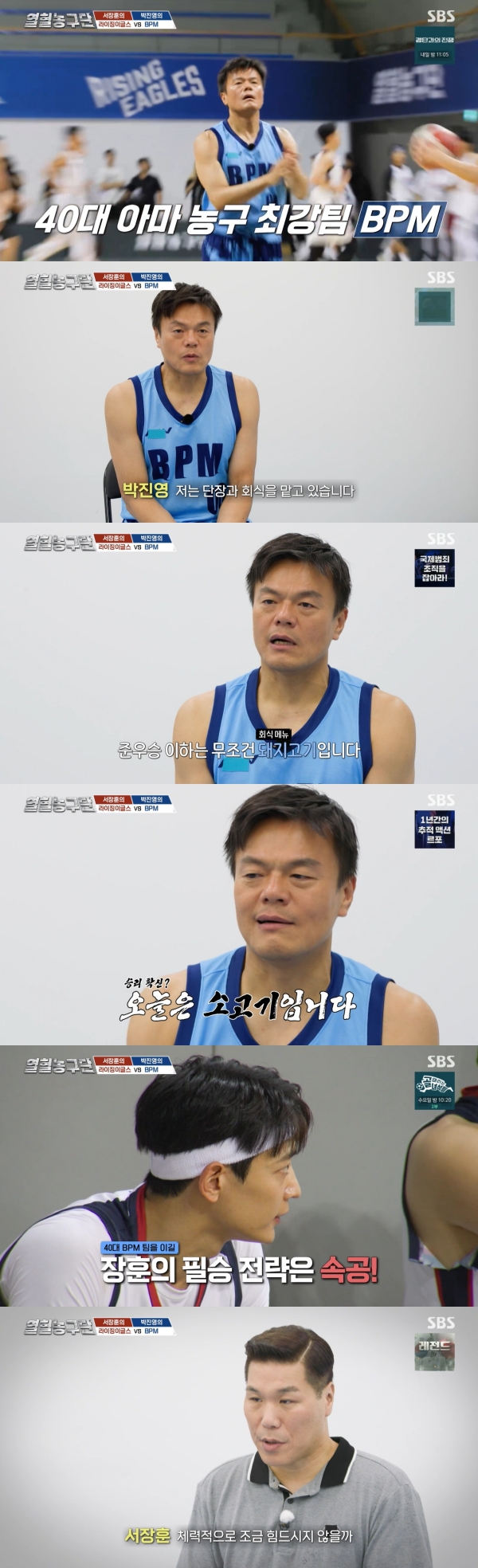 사진=SBS[스포츠투데이김태형기자]박진영이서장훈을상대로강한자신감을드러냈다.6일방송된SBS'열혈농구단'에는서장훈이이끄는라이징이글스와JYP엔터테인먼트프로듀서박진영이수장으로있는팀BPM의정면승부가그려졌다.이날박진영은"저는(BPM에서)단장과회식을맡고있다"며"준우승이하는(회식메뉴가)무조건돼지고기다.우승만소고기다.정확한룰이있다.그런데오늘은소고기다"라고자신감을드러냈다.서장훈은BPM전에대비해속공전략을제시했다.그는"아무래도상대팀평균연령이높고체력적으로힘드시지않을까생각했다"고말했다.박진영은선수들에게"연예인이라고안떨거라고생각하지말라.상대가우리보다더부담을느끼고떨릴것"이라며용기를북돋았다.[스포츠투데이김태형기자[email protected]]Copyright©스포츠투데이.무단전재및재배포금지.