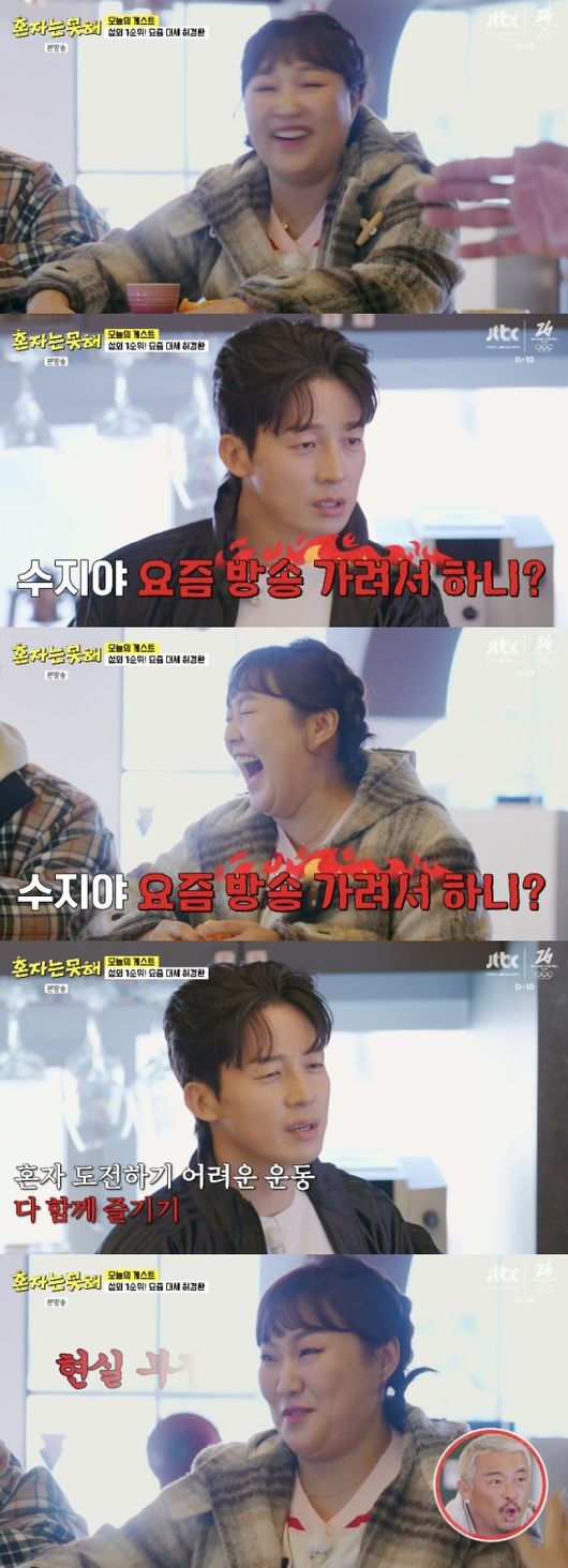 방송시청후작성된리뷰기사입니다.[OSEN=임혜영기자]허경환이후배이수지를저격해웃음을자아냈다.27일방송된JTBC‘혼자는못해’에는허경환이출연했다.이날이수지는게스트로출연한허경환에게함께하고싶은것이무엇이냐물으며“운동만같이안하면된다”라고말했고,허경환은“수지야요즘방송가려서하니?”라고일침을가했다.이수지의걱정대로운동을준비했다는허경환은“많은분들이돈내고온다”라고덧붙이며운동의중요성을강조했다.허경환이초대한애니멀플로우선생님이등장했다.선생님이선보인다소낯선동작에모두가당황했고누구보다진지한허경환은“동물이몇마리가바뀌었다”라고설명했다.선생님의리드에따라출연진들은동작을따라했다.이수지는힘든듯잠시딴청을했고,이를포착한허경환은바로지적했다.이수지는허경환에게“촉새냐.왜나만보고있냐”라고불만을드러냈다./[email protected][사진]JTBC‘혼자는못해’Copyright©OSEN.무단전재및재배포금지.