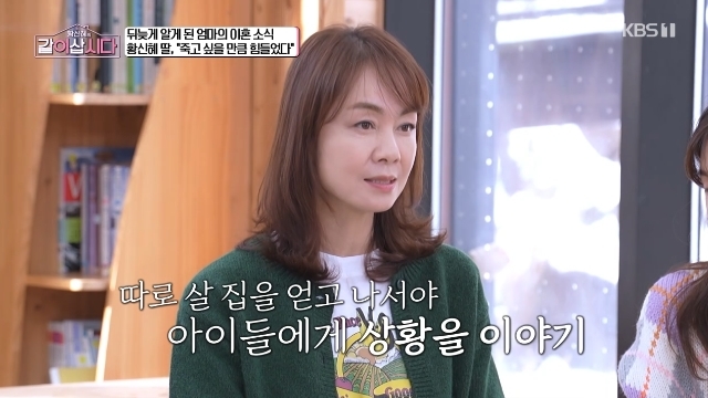 KBS1TV‘황신혜의같이삽시다’캡처KBS1TV‘황신혜의같이삽시다’캡처[뉴스엔서유나기자]미스코리아출신방송인장윤정이이혼당시자녀의반응을언급하며상처를줬을까봐걱정했다.1월28일방송된KBS1TV예능'황신혜의같이삽시다'4회에서는세싱글맘황신혜,장윤정,정가은이심리상담가박상미를만났다.이날장윤정은이혼을하던당시"전아이들을데리고나왔다.그상황을따로얘기안해도상황을자기들이아니까.그러고나서집을마련해왔을때제가잘한건지못한건지모르겠는데웃기려고했다.'너희들좋잖아.엄마집도있고아빠집도있고집이두채네'라고했다"고밝혔다.장윤정은딸들의반응이"'왜엄마아빠이혼해?'가아니라다그냥별말없이수긍하는것같더라"며"나중에시간이많이지나고나서야넌지시물었다.이혼한거에대해서안좋은소리듣거나하지않냐니까작은애가'엄마요즘에는이혼하신분들너무많아.난괜찮아'라고하더라.그때도마음이아팠다.'마음놓으라고일부러저렇게말하나'"라고걱정을털어놓았다.박상미가"그때그말을하라"고조언하자장윤정은"그게안나온다"며스스로도답답해했다.한편장윤정은1987년'제31회미스코리아선발대회'진,1988년'미스유니버스선발대회'2위출신으로여러방송프로그램에서MC로활동했다.1994년전국회의원의장남이상수씨와결혼했으나3년만에이혼하고,이후15살연상재미교포사업가김상훈과재혼했으나또파경을맞이했다.슬하에두딸을두고있다.뉴스엔서유나stranger77@기사제보및보도자료[email protected]ⓒ뉴스엔.무단전재&재배포금지Copyright©뉴스엔.무단전재및재배포금지.