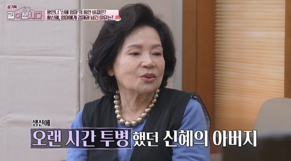 사진=KBS1같이삽시다캡처[스포츠투데이송오정기자]배우황신혜의효심이느껴지는일화가전해졌다.11일방송된KBS1'황신혜의같이삽시다'는황신혜,장윤정,정가은이각자의어머니와함께한설특집으로꾸며졌다.딸들이어머니를위한식사를준비하는동안,어머니들은거실소파에안자두런두런이야기를나누기시작했다.1940년생임에도동안미모인황신혜어머니에장윤정,정가은의어머니는놀라움을감추지못했다.그러자황신혜어머니는맏딸인황신혜의칭찬을늘어놓았다.어머니는"(황신혜와)같이사는데,자기아빠살아있을땐주변에서효녀심청이라했다.남편이병원생활을오래했다.위암수술랑당뇨로인해다리를절단했다.촬영이새벽에끝나도꼭병원에들렀다"라고말했다.이어"내가처음부터얘를데리고다니지않았나.그때는매니저가없었다.어떻게해야할지를몰랐다.제가운전해서데리고다녔다.그때부터돈을벌면서관리를내가한다.지금도얼마씩(용돈을)타서쓴다"라고밝혔다.[스포츠투데이송오정기자[email protected]]Copyright©스포츠투데이.무단전재및재배포금지.