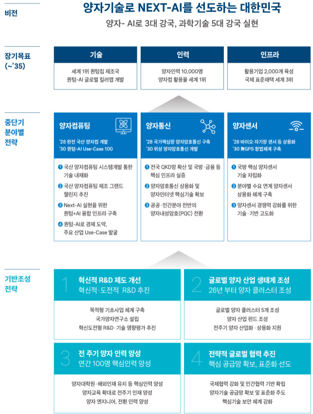 과기정통부,첫양자분야종합계획확정…2028년까지양자컴국산화양자기업2000개·인재1만육성…5대양자클러스터도조성삼성·LG·SK등주요기업참여‘양자기술협의체’…양자난제해결아이온큐글로벌양자인프라국내도입…3년간1500만달러투자[고양=뉴시스]정병혁기자=25일경기고양시킨텍스에서열린2024퀀텀코리아에한국표준과학연구원의초전도기반50큐비트양자컴퓨터모형이전시되어있다[email protected][서울=뉴시스]심지혜기자=정부가차세대인공지능(AI)시대를선도하기위한양자기술산업육성종합계획을확정했다.이번계획은단순연구개발(R&D)을넘어2035년까지세계1위퀀텀칩제조국달성,양자인력1만명양성,양자기업2000개육성을목표로한산업화중심로드맵이핵심이다.2028년까지국산풀스택양자컴퓨터를개발하고,지역기반양자클러스터를5개이내로지정해양자전환(QX)을추진한다.과학기술정보통신부는양자분야마스터플랜인'제1차양자과학기술및양자산업육성종합계획'과'제1차양자클러스터기본계획'을29일발표했다.[서울=뉴시스]과학기술정보통신부가양자분야마스터플랜인'제1차양자과학기술및양자산업육성종합계획'과'제1차양자클러스터기본계획'을확정했다.(사진=과기정통부제공)*재판매및DB금지양자기술은계산·통신·센싱전반에서기존기술한계를돌파하는파괴적혁신기술로,경제·안보·산업전반의판도를바꿀핵심기술로평가된다.미국·EU·중국·일본등주요국은양자를국가전략기술로지정하고대규모투자,기술동맹,수출통제등을통해기술패권경쟁을본격화하고있다.한국은2019년이후투자를확대해왔지만누적투자규모,산업화성과,인력풀에서여전히격차가존재해연구중심정책에서산업·시장중심전략으로의전환이요구돼왔다.배경훈부총리겸과기정통부장관은“양자기술은AI시대이후의국가경쟁력을결정지을파괴적혁신기술”이라며,“이번종합계획과클러스터기본계획을통해대한민국이글로벌양자기술과산업의중심지로도약할수있도록산·학·연·관등국가의모든역량을집중하겠다”고말했다.[서울=뉴시스]과학기술정보통신부가양자분야마스터플랜인'제1차양자과학기술및양자산업육성종합계획'과'제1차양자클러스터기본계획'을확정했다.(사진=과기정통부제공)*재판매및DB금지양자컴퓨터국산화추진…차세대AI시대대비우선정부는국산풀스택양자컴퓨터개발을통해양자컴퓨팅핵심기술을내재화할계획이다.양자처리장치(QPU)를비롯해극저온냉각기,제어·측정장비,초전도소자,양자IC,레이저등핵심소부장을포함한양자컴퓨터제조전주기기술확보가목표다.기업주도의기술개발을통해풀스택양자컴퓨터구현을추진하고,양자팹·파운드리기반과소부장성능시험인프라를확충해양자컴퓨터제조기반을구축한다.이를통해2035년까지세계1위퀀텀칩제조국으로도약한다는포부다.이과정에서2028년까지완전국산양자컴퓨터를구현하고,이후성능고도화와활용확산을단계적으로추진한다.양자컴퓨터활용확대를위해국가양자컴퓨팅허브와국가양자알고리즘센터를구축한다.바이오·화학·소재·정보보안등데이터확보가어려운분야를중심으로양자시뮬레이션기반데이터생성·제공을추진한다.자동차·제약·금융등분야에서는기존기술로해결이어려웠던산업난제를양자와인공지능(AI)을결합해해결하는산업활용사례(Use-case)경진대회를개최해활용모델을발굴하고,국내주력산업의경쟁력강화를추진한다.또한양자컴퓨터(QC)·슈퍼컴퓨터(HPC)·인공지능(AI)을결합한하이브리드컴퓨팅인프라를구축해연구자가자유롭게활용할수있는환경을조성할방침이다.이를통해2030년까지퀀텀-AI기반산업활용사례를100개이상발굴한다는계획이다.통신·센서상용화추진…국가핵심인프라보안·정밀감지강화정부는양자통신과양자센서의경우국가안보와산업경쟁력과직결된기술로설정하고,공공수요기반실증을통해활용을확대한다.전국단위양자암호통신(QKD)인프라를단계적으로확산해행정·국방·금융·에너지등국가핵심인프라를대상으로실증을추진한다.기존암호체계와의연계를고려해QKD와양자내성암호(PQC)를결합한하이브리드보안체계를적용하고장비소형화와기존통신망활용등을포함한비용절감기술개발도병행한다.정부는이를통해2028년까지국가핵심망양자암호통신을실증하고2030년까지위성기반QKD기술개발을달성한다는계획이다.장기적으로는양자메모리와양자중계기등양자인터넷핵심원천기술확보를추진한다.양자센서는국방과공공수요를중심으로활용을확대한다.무GPS양자항법시스템,중력·자기장센서등국방연계기술을대상으로파일럿프로젝트를추진하고,테스트베드를통해성능을검증한다.민간분야에서는반도체공정미세결함분석과수율모니터링,바이오·의료,재난·안전감지등활용가능분야를중심으로연구개발과실증을연계한다.이를통해2028년까지바이오·자기장센서활용확대를추진하고,2030년까지무GPS항법체계개발한다는계획이다.1만양자인재확보…기업2000개기업육성양자산업확산을위한기반조성전략으로전주기인재양성과산업생태계구축,국제협력을병행추진한다.2035년까지양자인력1만명양성,양자기업2000개육성이목표다.양자대학원과특화학부를