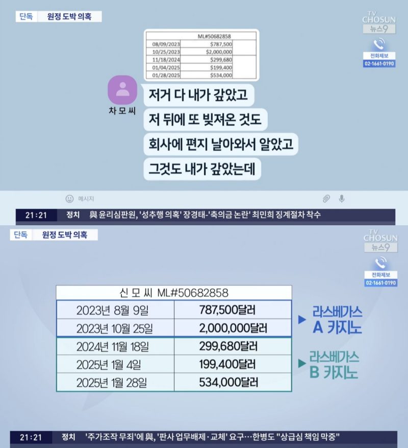 ⓒTV조선'뉴스9'[스포츠한국김희원기자]유명가수출신제작자가미국라스베이거스에서수년간원정도박을했다는의혹이제기됐다.29일TV조선은연예기획사회장차모씨가지난해6월회사특수관계인과나눈카카오톡대화를공개하고신모씨의원정도박의혹을보도했다.차씨는해당대화에서소속연예인이자제작자인신씨가미국라스베이거스호텔카지노에서받은총382만달러(약54억원)의단기신용대출금을대신갚아줬다고말했다.그는2023년8월과10월A카지노에서총278만7500달러,2024년11월부터지난해1월까지B카지노에서총103만3080달러가기재된엑셀파일을촬영해올렸다.이파일에는카지노가VIP고객에게제공하는단기신용대출을가리키는'마커론'(MarkerLoans)의약자'ML'과번호가적혀있었다.ⓒTV조선'뉴스9'신씨와차씨는엑셀파일에기재된날짜와비슷한시점에미국로스앤젤레스,라스베이거스를다녀간내역이확인됐다.당시회사관계자는"동행한일행중에서(신씨가)지금게임하고있으시다,언제내려가실것같다,이런말씀을…"이라고밝혔다.경찰은신씨의원정도박첩보를입수하고사실관계를확인중인것으로알려졌다.신씨는TV조선에"미국라스베이거스에업무차방문한적은있지만도박한적은없다"며카지노대출금내역은모두'허위'라고부인했다.스포츠한국김희원기자[email protected]©스포츠한국.무단전재및재배포금지.