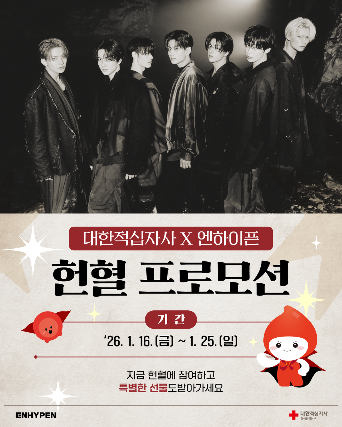 엔하이픈이대한적십자사와캠페인을진행해헌혈자대폭증가를이뤄냈다.대한적십자사제공아이돌의선한영향력이제대로빛을냈다.엔하이픈이적십자와캠페인을진행하면서헌혈자가크게증가했다.대한적십자사혈액관리본부는29일빌리프랩과나눔의사회적가치실현을위한업무협약(MOU)을체결하고,소속아티스트엔하이픈(ENHYPEN)과함께진행한헌혈캠페인이성황리에종료되었다고밝혔다.지난1월16일부터26일까지진행된이번캠페인은엔하이픈의‘뱀파이어’콘셉트를헌혈과접목한이색적인기획으로큰화제를모았다.캠페인이진행된서울주요헌혈의집(신촌·강남역·성수센터)과헌혈버스는엔하이픈의신규앨범테마로꾸며졌으며,전혈·혈소판헌혈자에게는‘블러드바이트’초콜릿과멤버전원의미공개포토카드가제공됐다.특히헌혈버스는엔하이픈의쇼케이스및음악방송일정,하이브용산사옥을순회하며운영됐다.헌혈의집강남역센터.빌리프랩제공캠페인기간열흘간오프라인헌혈자는총3,419명으로집계됐다.캠페인첫날서울3개헌혈의집은개소이후최대헌혈실적을기록했으며,온라인으로진행된포토카드증정이벤트역시4,311명이몰리며높은관심을입증했다.이번캠페인은젊은세대의적극적인헌혈참여를이끌어내는동시에신규헌혈층을확대하는성과를거두었다.캠페인시행직전기간(1월2일~11일)54명이었던생애첫헌혈자수는캠페인기간1,031명으로늘어나약19배로증가했으며,오프라인헌혈참여자중10대와20대의비율은헌혈의집70%,헌혈버스80%를차지했다.대한적십자사혈액관리본부권소영본부장은“겨울철한파와방학이겹치며혈액보유량이관심단계에머무는상황이였으나,엔하이픈팬덤인‘엔진(ENGENE)’의적극적인참여덕분에혈액수급에큰도움을받았다”며감사의뜻을전했다.헌혈의집강남역센터.빌리프랩제공양승남기자[email protected]©스포츠경향.무단전재및재배포금지.