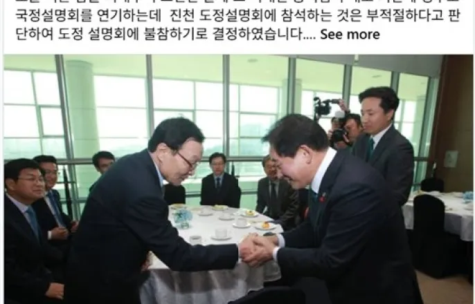 송군수"이해찬총리빈소지킬것"…"윤석열옹호"김영환직격도김지사"군수가함께하지못해아쉬움있지만뜻존중"송기섭진천군수페이스북글[송기섭진천군수페이스북글캡처재판매및DB금지](진천=연합뉴스)천경환기자=충북도의'도민과의대화'일정이송기섭진천군수의불참공표로시작부터삐걱거리는모습이다.송군수는29일자신의페이스북을통해"오늘김영환지사의진천도정보고회에불참한다.고이해찬전국무총리님의애도기간에도정보고회에참석하는것은부적절하다고판단했다"고알렸다.송군수는"정부도국정설명회를연기하는등고인을기리고있다"며"충북도에수차례연기또는축소를요청했고,오늘도정설명회를축소하는것으로협의했다.저는도정설명을들을기회의장을마련하는것으로군민과도에대한제역할을다했다고생각한다"고밝혔다.그가"총리님의빈소를지키며상주역할을하겠다"고불참이유를재차밝혔지만,지난8일더불어민주당주자로는처음으로충북지사선거출마를공식화한그가김지사를의도적으로피한것아니냐는지적도나온다.송군수는"탄핵국면에서계엄선포는대통령의고유권한이고면책범위에포함된다고윤석열을옹호한분이계시고,보재이상설선생의뜻을받들고자지자체최초로'친일재산환수'를추진하고이를충북전체로확산하길기대했으나아무런응답이없다.아직도'기꺼이친일파'가되고자하는분이계신지모르겠다"는글로김지사에게날을세웠다.김지사는이날진천군청기자실을찾아"충북의우등생인진천은현재새로운도약의계기와변화의과정을겪고있다"며"단순히공단만확충하는것이아니라문화,교육,환경등소프트웨어분야를강화해야할시기"라고말했다.그러면서"군민의의견을청취하고지역발전을고민하는자리에군수가함께하지못해아쉬움은있지만그뜻을충분히존중한다"며"군민과직접소통하며지역현안을논의함에있어소홀함이없도록잘챙기겠다"고덧붙였다.도는이날진천군을시작으로,다음달13일까지도내11개시군을순차적으로방문해도민과의대화를진행한다.김지사는민생현장과도정주요현안사업장을직접방문하는한편주민간담회및도민과의대화등을열어지역현안과건의사항등생생한현장의목소리를청취할예정이다[email protected]▶제보는카톡okjeboCopyright©연합뉴스.무단전재-재배포,AI학습및활용금지