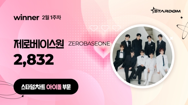 ▲제로베이스원이2월첫째주'스타덤차트'아이돌부문주간랭킹에서1위를차지한투표결과이미지.제공|스타덤[스포티비뉴스=김원겸기자]그룹제로베이스원이'스타덤차트'아이돌부문에서처음으로1위에올랐다.제로베이스원은26년2월1주차(집계기간2월2일~2월8일)'스타덤차트'아이돌부문주간랭킹에서1위를차지했다.제로베이스원은지난주1위를차지했던엔싸인을밀어내고감격의정상에올랐다.제로베이스원은집계기간동안2832표를얻어1위에올랐다.시크릿넘버는480표로2위를차지했고,3위는464표를얻은방탄소년단이다.한편'스타덤차트'2월1주차배우부문주간랭킹에서는김수현이17주연속1위를차지했다.트로트부문에서는김용빈이10주연속정상의자리를지켰다.음원부문에서도김용빈'어제도너였고오늘도너여서'가20주연속1위를차지했다.다양한부문의랭킹을보여주는'스타덤'은스타와팬들을연결해주는모바일애플리케이션으로,'나의최애셀럽을우주대스타로만든다'는캐치프레이즈아래스타와팬들을다양한방식으로연결한다.<저작권자ⓒSPOTVNEWS.무단전재및재배포금지>Copyright©스포티비뉴스.무단전재및재배포금지.