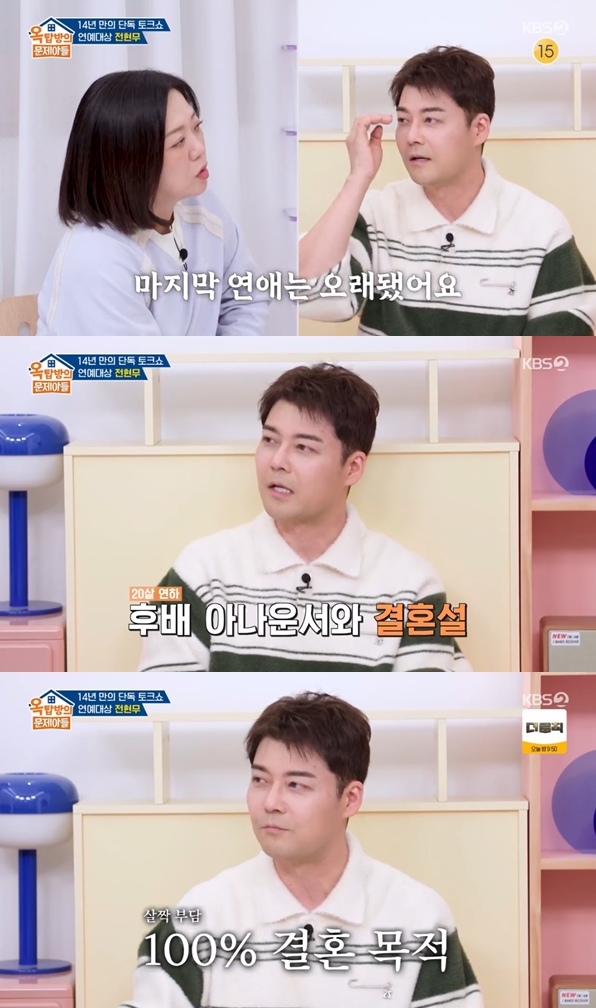 ▲출처|KBS2'옥탑방의문제아들'캡처[스포티비뉴스=최신애기자]전현무가결혼에대한모든것을허심탄회하게털어놨다.29일방송된KBS2'옥탑방의문제아들'에는'연예대상'을받은전현무가출연했다.이날전현무는결혼질문에"저도이제곧반백살이다"라며최근늦깎이결혼을한김종국에게"어떻게결혼을하게됐냐"고질문을토스했다.이에김종국은"결혼을해야겠다는생각이무조건있었다"고답했고,전현무는"여사친이여자로보인건가?"라고다시물었다.김종국은"(아내가원래는)아는동생이었는데'이사람과결혼하면행복하고좋겠다'는생각이들었다"고답했다.그러자전현무역시"결혼생각은있다.정말저분이면하겠다싶으면할건데,결혼이라는것을위해결혼을하는것은싫다"고전했다.이같은이야기도중이날계속해서전현무에게플러팅을던진홍진경은"마지막키스는언제냐"고돌발질문을던졌다가"마지막연애"로바꿨다.전현무는"한3년된것같다"고답했다.또한전현무는"열애설이많이나는것같은데괜찮냐"는질문에는"(대중분들이)재미가있으신것같다.예능하는사람중에결혼안한사람이거의저밖에없다.그래서그런것같다"고덤덤하게말했다.그러면서"가짜뉴스도저는괜찮다"며"얼마전에20살연하후배아나운서홍주연과열애설이났다.박명수형이결혼날짜,'슈돌'까지말하는바람에기사가많이나갔다.난아무것도한게없는데욕을먹는다.그래도후배의이름이좀알려져서다행"이라고전했다.그러자김종국은"이것도어떻게보면재능기부네"라고쌩뚱맞게말해폭소를안겼다.이어전현무는"이젠선이안들어오냐"고묻자,"들어오긴하는데제가잘안나간다.저라는사람을알고결혼을하려고나오시는거라서그렇다"며부담이있다고전했다.<저작권자ⓒSPOTVNEWS.무단전재및재배포금지>Copyright©스포티비뉴스.무단전재및재배포금지.