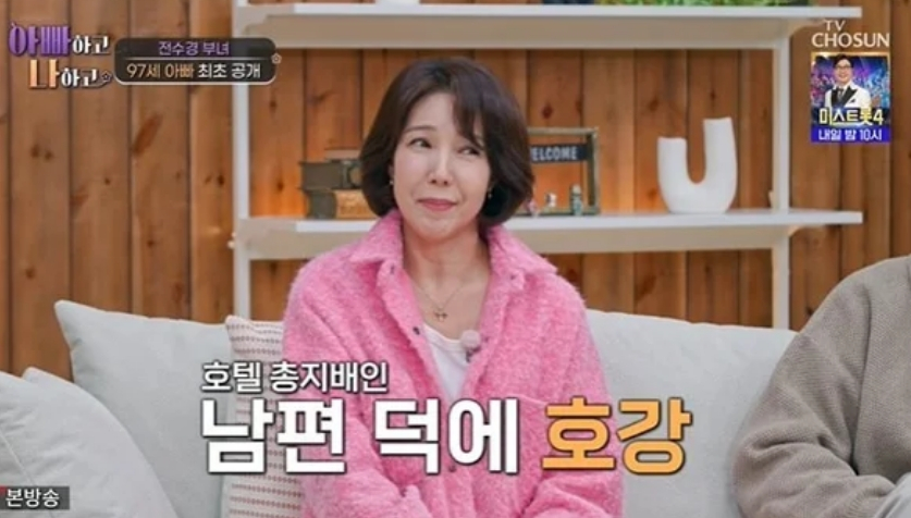 배우전수경이한국계미국인남편과호텔에서신혼생활을했던경험을추억했다./사진=TV조선'아빠하고나하고'방송화면배우전수경이한국계미국인남편과호텔에서신혼생활을했던경험을추억했다.지난4일방송된TV조선예능프로그램'아빠하고나하고시즌3'에는전수경이합류했다.데뷔39년차배우이자1966년생전수경은"제가병오년생이다.병오년에태어나서병오년을맞이하는게평생한번이다.저에게는굉장히중요한해다"라고말했다.전현무는"거짓말안하고저아나운서때봤다.똑같다"라고전수경의동안미모에감탄했다.전수경은쌍둥이딸의엄마이자,2014년미국인남편과재혼한바있다.임형주는전수경남편에대해"엄청유명한호텔의총지배인이셨다.제가그호텔단골이었다"라고전했다.이를들은전수경은"굉장히부유했구나"라고반응해웃음을자아냈다.전수경의남편은5성급호텔인밀레니엄힐튼서울의총지배인이었다.해당호텔은2022년12월31일영업을종료했다.배우전수경이한국계미국인남편과호텔에서신혼생활을했던경험을추억했다./사진=TV조선'아빠하고나하고'방송화면특히임형주는"그호텔스위트룸에서살지않았나"라고물어이목이쏠렸다.전수경은신혼생활을5성급호텔스위트룸에서했다며고개를끄덕였다.전수경은"부자가부럽지않은게그런호텔에서몇년살아볼수있는게특별한경험아니냐"라며"조식은기본이었고,룸서비스도했다"라고털어놔부러움을자아냈다.이를지켜보던전현무는"뭐야제일부유하구먼"이라고반응해웃음을더했다.전수경은"그렇게좀살았다,부러울것없이"라며미소를지었다.마아라기자[email protected]©머니투데이&mt.co.kr.무단전재및재배포,AI학습이용금지.