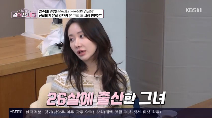 '황신혜의같이삽시다'21일방송KBS1TV'황신혜의같이삽시다'캡처(서울=뉴스1)이지현기자=결혼7년만에이혼한한그루가'황신혜의같이삽시다'에등장했다.21일오후방송된KBS1TV예능프로그램'황신혜의같이삽시다'에는가수겸배우한그루가출연,이혼후쌍둥이를홀로키우는'싱글맘'근황을전했다.올해나이를묻자,그가"92년생,34살이다"라고밝혔다.이어"24살에결혼해서26살에임신하고아이를낳았다"라고해출연진을깜짝놀라게했다.황신혜는"애가애를낳은거야"라며놀랐고,정가은이"친구들은다노는데,그때부터육아했구나~"라고거들었다.KBS1TV'황신혜의같이삽시다'캡처특히한그루가"그리고4년전에돌아왔다"라며이혼사실을고백했다.멤버들이"돌아왔어?"라면서또한번놀란표정을지었다.정가은,장윤정은"여기가정말편하겠다","웰컴"이라며같은'싱글맘'으로서그를반겼다.한그루가"현재남매쌍둥이키우고있다.둘다9살이다.초등학교3학년올라가는나이.너무시간이빠르다"라고털어놔눈길을끌었다[email protected]©뉴스1.Allrightsreserved.무단전재및재배포,AI학습이용금지.