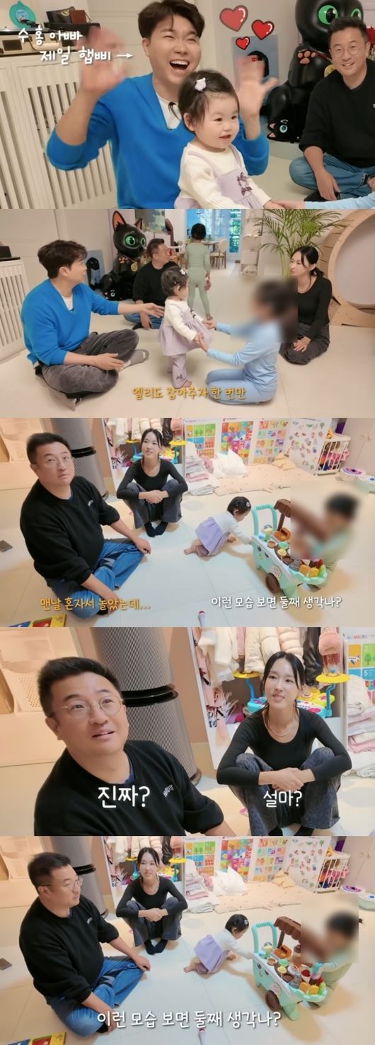 방송시청후작성된리뷰기사입니다.[OSEN=임혜영기자]김다예가박수홍에게둘째에대해언급했다.지난5일채널‘박수홍행복해다홍’에는‘많을수록좋다ㅣ관종언니이지혜태리엘리언니들의재이네방문!’이라는영상이게재됐다.이날박수홍,김다예의집에는이지혜,문재완부부와두딸이방문했다.아이들이점점친해져세자매같은분위기를형성하자박수홍은흐뭇한듯바라보며미소를멈추지못했다.박수홍은“언니들있으면이렇게잘노는걸.맨날혼자놀았는데”라고말했고김다예는“이런거보면둘째생각나?”라고물었다.이에박수홍은“아니이런걸보면(이지혜가족)바로옆에서살아야겠다는생각이든다”라며김다예에게부담주지않는답변을내놓았다./[email protected][사진]채널‘박수홍행복해다홍’Copyright©OSEN.무단전재및재배포금지.