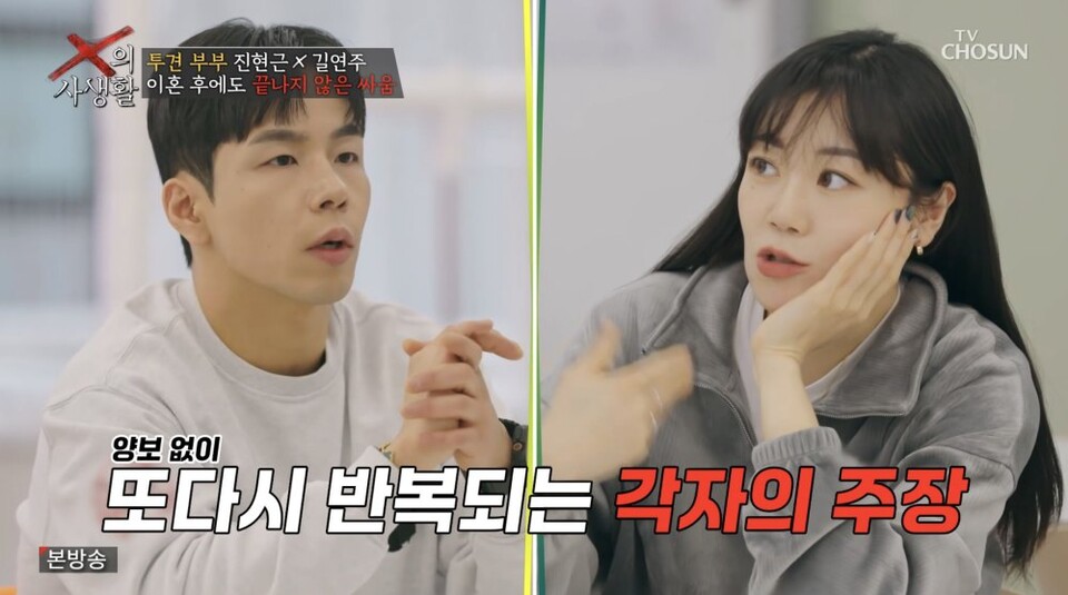 ⓒTV조선'X의사생활'[스포츠한국김도아기자]투견부부가이혼후에도아이앞에서싸웠다.7일방송된TV조선'X의사생활'에서는면접교섭일에아들과함께키즈카페에간투견부부진현근,길연주의모습이그려졌다.진현근은면접교섭일이되자아들을만나러2시간거리를달려갔다.키즈카페에서엄마길연주와있던아들은아빠가문을열고등장하자좋아하면서도엄마의눈치를살폈다.진현근은아들을안아주며반가워했지만길연주와는인사도하지않고눈도피하며마치없는사람취급했다.스튜디오에나와있던길연주는아이와단둘이만나면되지않냐는MC장윤정의의문에"그러고싶은데(전남편이)꼭셋이봐야한다더라"며"아이의정서를위해서라는데이게더안좋은거아니냐"고답했다.또셋이만나자는제안을거절하면진현근이'그러면아들보러안간다'고해어쩔수없다며"성격이이상한것같다"고전남편을비난했다.아이의재롱덕분에잠시나마화기애애한모습을보였던진현근,길연주는금세다시차가워졌다.진현근은아들에게선물한영어책을가리키며길연주가"이거시우가못읽는건데?"라고하자못들은척무시했다.그는무표정한얼굴로휴대폰을보더니"양육비보냈다.근데10일에보내는건데왜맨날일찍보내달라고하냐"고물었고,길연주는"미리미리받으면좋으니까"라고만말했다.ⓒTV조선'X의사생활'진현근은바빠서아이를만나러가지못할때아이사진을보내달란부탁을왜들어주지않냐고불만을털어놨다.길연주는"네가와,애보러.내가왜사진을보내주냐니까?네가보러와야지,애보고싶으면"이라고받아쳤다.바로옆에있던아들은눈치를보더니장난감을치우는척자리를벗어났다.아이의정서를위해셋이만나야한다고고집한진현근은아들이혼자노는동안길연주와입씨름을벌였다.진현근은일이바빠면접교섭을하지못하는날이있으면사진이라도보내달라고했고,길연주는이미면접교섭횟수를월2회에서1회로줄인만큼더는양보할수없다고맞섰다.두사람은같은얘기를반복하며싸웠고점점언성이높아졌다.아들은여전히혼자서놀았다.숨막히는시간끝에결국두사람은아이의사진과영상을한달에한번이상주고받기로했다.약속과함께싸움이끝나는듯했지만진현근이아이의영어교육방식에대해따지면서2차전이시작됐다.길연주는"야"라고부르며화를냈고,더는얘기하고싶지않다며자리에서일어나아들에게가면서싸움이끝났다.스포츠한국김도아기자[email protected]©스포츠한국.무단전재및재배포금지.