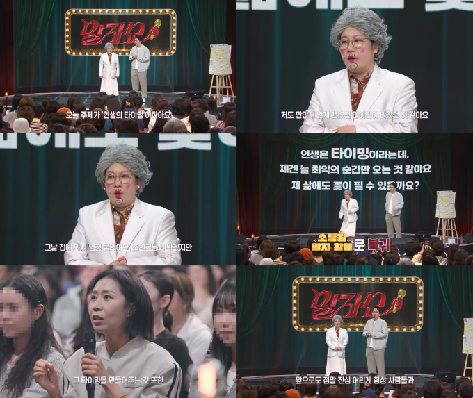 ‘말자쇼’(사진=KBS)'말자쇼'김영희가인생의황금타이밍에관해이야기를나눴다.지난6일방송한KBS2'말자쇼'는'인생의타이밍'특집으로꾸며졌다.이날방송에선"인생은타이밍이라는데제겐늘최악의순간만오는것같아요.제삶에도꽃이필수있을까요?"라는고민이등장해모두의공감을샀다.'말자할매'김영희는자신의인생도꼬인타이밍의연속이었다고털어놨다.그는"'개그콘서트'의'두분토론'으로데뷔한줄아는사람들이있지만그때까지의과정은어긋난타이밍의연속이었다"고밝혔다.김영희는KBS개그맨이되기전OBS공채1기로뽑혔다고말했다.하지만방송사에선개그프로그램을만들지않았고,그는MBC개그맨시험을다시봐서합격하게됐다.김영희는"그런데당시MBC개그프로그램은신인보다기성개그맨을중용하던시기였다"며"한번은관객역할을했다.그날집에와서엄청울었다"고털어놨다.이후김영희는마지막이라는심정으로도전한KBS시험에서합격했고,본래혀경환-박영진'남남조합'이었던'두분토론'이남녀콘셉트로바뀌는결정적인'타이밍'을잡아비로소꽃을피울수있었다고밝혔다.무엇보다김영희는현재의'말자할매'를있게한일등공신으로동료정범균을꼽았다.김영희는"무미건조한시간이길었지만정범균덕분에복귀할수있었다"며"그만두고싶을때마다내화를눌러준정범균을만난것이인생최고의타이밍"이라고강조했다.김영희의이야기를듣던게스트정선희는"좋은타이밍을만들어주는것또한사람"이라며자신은위기때마다신동엽같은좋은사람이있었다고말했다.그러면서"싸우고싶을때옆에돌을쥐여주는사람이있는건위험하다.정범균처럼눌러주는사람이있다는건반은성공"이라며정범균을치켜세웠다.이밖에이날'말자쇼'에서는'맨날자기가더힘들다는사람'과'걱정하는척자존감을깎는사람'중누가더인생에독이되는인간인지관객들과이야기해보는시간을가졌다.한편,KBS2'말자쇼'는매주월요일밤9시30분방송한다.Copyright©bnt뉴스.무단전재,재배포및AI데이터활용금지