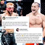 ‘디스전’에도어느정도의수준이있다.그러나패디핌블렛과댄후커는분명끔찍했다.핌블렛과후커는최근공개적으로충돌했다.핌블렛이시작한이번‘디스전’은‘패드립’과‘고인능욕’이이어졌다.먼저핌블렛은‘MMA그루’와의인터뷰에서“후커는자기엄마를건드리는XXX도제대로떼어내지못할거야”라고이야기했다.핌블렛과후커는최근공개적으로충돌했다.핌블렛이시작한이번‘디스전’은‘패드립’과‘고인능욕’이이어졌다.사진=챔피언십라운드SNS핌블렛은후커가지난아르만사루키안전에서그래플링문제로고전한것을비판했다.다만‘패드립’을선택한것이문제였다.이에후커는SNS를통해“직접만났을때는아무말도못했잖아,이XX야”라며“난우리가친구인줄알았는데넌그렇게좋은사람은아닌것같네?”라고답했다.후커는여기에‘R.I.P리키’라는문구를더했다.리키는과거스스로세상을떠났던핌블렛의친구.핌블렛은과거승리인터뷰에서리키의이야기를꺼낸적이있다.후커는SNS를통해“직접만났을때는아무말도못했잖아,이XX야”라며“난우리가친구인줄알았는데넌그렇게좋은사람은아닌것같네?”라고답했다.여기에‘R.I.P리키’라는문구를더했다.리키는과거스스로세상을떠났던핌블렛의친구.핌블렛은과거승리인터뷰에서리키의이야기를꺼낸적이있다.사진=챔피언십라운드SNS후커의공격은여기서끝나지않았다.그는“길에서보면바로간다,이뚱뚱한XX야”라고경고했다.핌블렛도곧바로반응했다.그는SNS를통해“내가너보다랭킹이높아서친구는아니라고생각했는데?”라며“네그래플링이얼마나형편없는지농담한걸로스스로세상을떠난내친구를언급해?그건진짜최악이었다.길에서보자고?좋다,받아들인다.넌파이터로서완전히쓰레기야”라고전했다.한편핌블렛은오는UFC324에서저스틴게이치와라이트급잠정타이틀전을치른다.그리고후커는UFC325에서브누아생드니를상대로반등을노리고있다.핌블렛은‘MMA그루’와의인터뷰에서“후커는자기엄마를건드리는XXX도제대로떼어내지못할거야”라고이야기했다.사진=케이지펄스SNS핌블렛과후커가당장만날가능성은크지않다.핌블렛은‘라이트급챔피언’일리야토푸리아를바라보고있다.후커는사루키안에게패배하면서타이틀경쟁에서는조금밀린상황이다.물론변수는있다.토푸리아가개인사로인해1분기출전이불가능한상태.그렇다고해서올해안에복귀할수있을지도정확히알수없다.그렇기에핌블렛와게이치의잠정타이틀전승자가토푸리아대신챔피언이될수있다는예상도존재한다.만약핌블렛이게이치를꺾은후토푸리아의이탈로챔피언이될경우후커를상대로타이틀방어전을치를수도있다.가능성은크지않으나0%는아니다.그리고이번‘디스전’은하나의재료가될수있다.핌블렛과후커의갑작스러운‘디스전’.어쩌면라이트급경쟁에서새로운서사의시작일수있다.사진=MMA정키SNS[민준구MK스포츠기자]