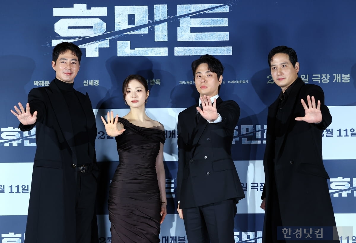 '베를린'을잇는세계관액션너머의감정'휴민트'배우조인성,신세경,박정민,박해준이12일오전서울자양동롯데시네마건대입구점에서열린영화'휴민트'(감독류승완,제작외유내강)제작보고회에참석해포토타임을갖고있다./변성현한경닷컴기자[email protected]"시원인성,이글정민,열정해준.우리는휴민트에요!"차가운바다와국경,그리고정보가교차하는도시블라디보스토크.류승완감독이선택한곳이다.베를린','모가디슈'로이어진그의필모그래피위에새롭게더해진영화'휴민트'는전작들과궤를같이하면서도,보다이국적이고낯선풍경속에서새로운긴장감을선보일예정이다.'휴민트'는비밀과진실이차가운바닷속으로가라앉는도시블라디보스토크를배경으로한다.서로다른목적을품은인물들이한공간에서충돌하며,정보전과감정의균열이동시에펼쳐지는첩보액션영화다.국정원요원,북한국가보위성간부,북한총영사,그리고정보원이되는여성까지네인물의시선이교차하며서사가확장된다.북한과러시아의접경지역에서벌어지는사건의실마리를좇아이도시에모이게된네인물의이야기를그린'휴민트'는,류감독이구축해온해외로케이션세계관을한층확장하는작품이다.'휴민트'는'베를린'과세계관을공유하는지점이있어호기심을끈다.영화'휴민트'스틸컷/사진=NEW이번작품에서류승완감독이중심에둔키워드는구원과희생이다.서로다른목적과신념을지닌인물들이충돌하며만들어내는관계의균열과선택의순간을따라가며,관객에게묵직한질문을던진다.감독은이러한주제에집중하기위해화려한기교보다는절제된연출을택했다.장면을빠르게소비하기보다는인물과상황을충분히쌓아올리는방식이다.12일서울광진구롯데시네마건대입구에서열린'휴민트'제작보고회에서류감독은"이번영화의대표키워드는재미와긴장"이라며"촬영이끝난뒤모니터를보면서도저도모르게움찔하는순간들이있었다.반신욕정도하고오시는게좋을것"이라고말해기대감을높였다.조인성은국정원블랙요원조과장역을맡았다.조과장은냉철한판단력으로임무를수행해온인물이지만,정보원을잃은이후트라우마와인간적인갈등을안고움직인다.'모가디슈','밀수'에이어'휴민트'까지함께하게된조인성은류승완감독의페르소나라는표현에대해"저는그렇게생각하는데감독님이나제작사외유내강은어떻게생각할지모르겠다"며"저보다감독님과더많은작품을함께한배우들이있다"고말했다.황정민,정만식등을언급하며"그선배들을이길수는없기때문에,페르소나가될수있도록노력하겠다"고너스레를떨었다.영화'휴민트'스틸컷/사진=NEW세번째로류승완감독과호흡을맞춘소감에대해서는이전작품에서쌓은신뢰를언급했다.조인성은"전작들이해외에서오랜시간체류하며찍은작품들이라우리들만의정이있었다"며"작업을거듭하면서더가까워졌고,서로를잘알다보니감독님이원하는방향을더잘읽을수있었던것같다"고말했다.액션연기에대한부담도솔직하게털어놨다.그는"류승완감독님은액션을굉장히잘아시는분"이라며"손을뻗는각,맞았을때의리액션같은디테일을하나하나짚는다.몸을사리지않으면오케이를받기힘들었다"고전했다.이어"라트비아현지스태프들도감독님이직접액션시범을보이는걸보고놀랐을것"이라며"그걸보니배우로서더몸을사릴수없었다"고했다.조과장의액션에대해서는"품위있게보이려고노력했지만쉽지않았다.그런액션을어디서팔면사서하고싶을정도"라고웃으며말했다.박정민은북한국가보위성조장박건을연기했다.박건은냉정하고기민한판단력으로임무를수행해온인물이지만,블라디보스토크에서채선화와마주한이후감정의균열을겪는다.박정민은캐릭터에대해"감정적인균열을느끼기전과후의액션이다르다"며"선화와느끼는감정도있지만조과장과의브로맨스도있다.감정의중심에서있는인물"이라고설명했다.영화'휴민트'스틸컷/사진=NEW류승완감독과의작업과정에대해박정민은"류승완감독님은우리나라액션을대표하는감독"이라며"연기를앞두고깊이있는연습이필요했는데,현장에서저만보면합기도를거셨다"고말했다.이어"방에찾아와서이렇게하는거라며손을꺾으시더라.멀리서보면조카괴롭히는삼촌같았지만,그만큼많이배웠다"고회상했다.이날현장에서는박정민의달라진인상도언급됐다.MC박경림이외모변화를칭찬하자조인성은"인정한다.비주얼배우를물려줄때가됐다.차세대비주얼배우"라고말해웃음을자아냈고,박정민은손사래를치며쑥스러워했다.류감독은"'밀수'당시박정민에게어부의몸을만들어달라고했다.벌크업해서어부의근육을요구했다.벌크업중살크업을하던도중정말꼴보기싫은모습을처음봤다"며"이번영화에선완전히달라진모습을보여줄것"이라고귀띔했다.신세경은북한식당종업원채선화역을맡았다.채선화는생존을위해정보원이되는선택을하며,영화의감정적중심축을형성하는인물이다.신세경은12년만에스크린에복귀하는소감으로"너무많이설렌다"며"좋은배우들과함께한작품으로관객들을만난다는점이특히의미있다"고말했다.영화'휴민트'스틸컷/사진=NEW장기해외촬영에대해서는"집이아닌곳에서중장기로머무는게쉽지는않다"면서도"저에게는그시간이오히려즐거웠다.한도