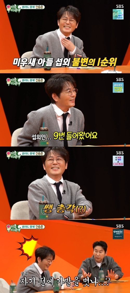 ‘미운우리새끼’사진|SBS신승훈이‘미운우리새끼’섭외만9회들어왔다고말했다.5일오후방송된SBS예능프로그램‘미운우리새끼’(이하‘미우새’)에는발라드황제신승훈이오랜만에모습을보였다.이날방송에서서장훈은“‘미우새’제작진이늘얘기하는데‘미우새’섭외1순위”라고말했다.이에신승훈은“제가미우새섭외만9번들어왔다”고인정했다.서장훈이“많은분이아침에일어나는것부터하루를어떻게보내는지궁금해한다”고하자신동엽은“자기전에진짜로가발을벗고자는지궁금하다”고말해웃음을안겼다.신승훈은“가발돌아갔냐”며맞받아쳐웃음을더했다.‘미운우리새끼’는일요일오후9시5분SBS에서방송된다.[서예지스타투데이객원기자]Copyright©스타투데이.무단전재,재배포및AI학습이용금지