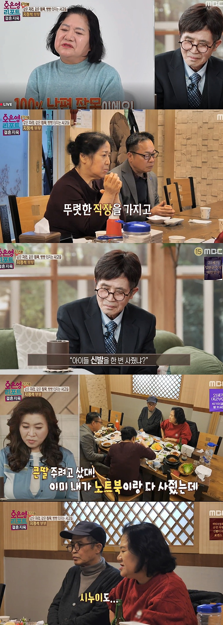 사진=MBC‘오은영리포트-결혼지옥’방송캡처지정석부부아내가47년간생활비를책임져온현실을토로하며분노를터뜨렸다.6일방송된MBC‘오은영리포트-결혼지옥’(이하‘결혼지옥’)에서는같은자리,같은침묵속갈등을이어온지정석부부의일상이공개됐다.이날아내는집에돌아온뒤남편에게짜증을쏟아내며“이렇게된건100%남편잘못”이라고직격했다.다음날아침에도눈을뜨자마자사소한일로잔소리를이어갔다.하지만곧남편에게외출을제안하며“오늘은당신이낼거지?”라고말하는등경제적인부분에민감한모습을보였다.이후퇴근시간과겹쳐차량정체가시작되자아내의표정은급격히굳었고,반면남편은조수석에서라디오에집중하며대비되는태도를보였다.가족들과의식사자리에서는갈등의원인이더욱선명해졌다.친정오빠는남편에대해“결혼후지금까지뚜렷한직장이나경제활동이없었다”고지적했고,아내의여동생역시“살림에1%도도움이안된다”고쓴소리를보탰다.아내는제작진과의인터뷰에서“아이들한테신발한켤레도제대로사준적이없는것같다.철이없다”고털어놓으며깊은불만을드러냈다.특히경제문제로인한갈등은과거에도있었다.아내는“큰딸결혼식에돈은안보태면서본인쓸컴퓨터를사왔다”며당시상황을떠올렸다.이어“답답해서시누이에게하소연했더니오히려욕을들었다”고덧붙였다.이에남편은“왜좋은데다녀와서하소연하냐.컴퓨터산게그렇게잘못이냐”고반박했고,갈등은점점격해졌다.남편이“나만보면돈돈돈한다”고말하자,아내는“내가돈을한번쥐어봤어야지”라고분노를터뜨리며오랜세월쌓인감정을드러냈다.김지혜기자[email protected]©일간스포츠.무단전재및재배포금지.