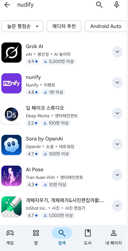 28일구글플레이스토어에‘누디파이’라고검색하자관련앱이뜬모습.최민지기자구글의애플리케이션(앱)마켓인플레이스토어에‘누디파이’(Nudify·누드합성)라는키워드를넣자관련앱이주르륵뜬다.여성의신체를노골적으로묘사한이미지를내걸고있는이들앱의다운로드수는적게는수만회,많게는수천만회에이른다.인공지능(AI)으로성착취이미지를생성하는누디파이앱이활개를치고있다.앱마켓을운영하는구글과애플이이를방치하며짭짤한수익을올리고있다는지적도나온다.미국의비영리단체기술투명성프로젝트(TTP)는27일(현지시간)이같은내용의보고서를공개했다.TTP는최근AI챗봇‘그록’이성착취이미지생성·유포로논란이인것을계기로양대앱마켓(플레이스토어·앱스토어)을조사했다.보고서에따르면,TTP가문제라고지적한누디파이앱은전세계적으로다운로드건수가약7억500만회를기록했다.이들앱이올린누적매출만1억1700만달러(약1665억원)으로추정된다.애플과구글이인앱결제수수료(최대30%)를가져간다는것을고려하면이들이누디파이앱을통해얻은수익은수백억원에달할것으로보인다.TTP는AI로생성한가상의여성이미지를이용해누디파이앱테스트도진행했다.옷을입은여성사진을주고옷을벗겨달라고하거나,여성의얼굴사진만주고나체와합성해달라고주문했다.그러자안드로이드앱55개와iOS앱47개가나체의여성이미지를만들어냈다.TTP는“양대마켓이사용자안전을강조하면서도누디파이앱의확산속도를따라가지못하고있다”고꼬집었다.TTP는“프롬프트(명령어)몇줄또는버튼한번으로여성의옷을벗기거나성적인영상으로만드는것이가능했다”면서“경고나차단장치는거의없었으며상당수앱이전연령혹은12세이상으로분류돼있었다”고지적했다.AFP이미지생성형AI가대중화한이후이를활용한성착취물제작문제는끊이지않고있다.최근에는일론머스크의xAI가SNS엑스내에서운영하는챗봇그록에이미지편집기능이추가되면서비판에직면했다.이용자들이이기능을활용,원본당사자동의를받지않은성착취물을다량생성·유포했기때문이다.미성년인피해자가속출하면서미국·유럽연합(EU)등각국당국은공식조사에착수했다.국내에선지난14일방송미디어통신위원회가그록에청소년보호장치를마련하라고요청했다.국내에서도AI를이용한성착취물제작및유포는심각한문제지만법이현실을따라가지못하는실정이다.2024년개정된성폭력처벌법은딥페이크성착취물제작·유포는물론시청·소지·구입·저장한경우에도3년이하의징역또는3000만원이하벌금으로처벌하도록돼있다.그러나지난해AI로만든성착취물의피해자가특정되지않으면성폭력처벌법상허위영상물유포죄로처벌할수없다는법원판결이나오며한계를노출했다.최민지기자[email protected]©경향신문.무단전재및재배포금지.