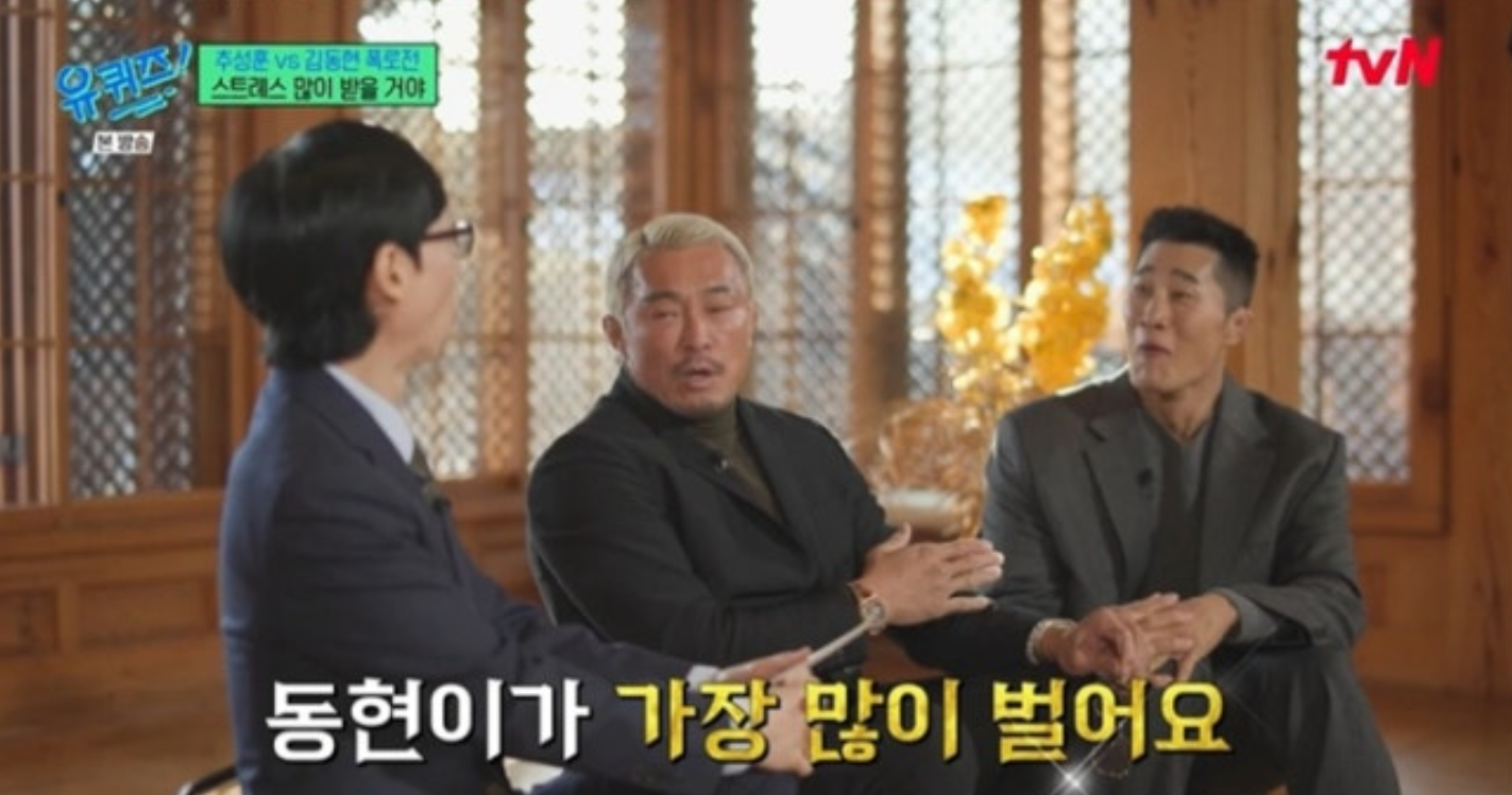 사진제공|tvN[스포츠동아이수진기자]이종격투기레전드추성훈과김동현이‘유퀴즈온더블럭’에서웃음섞인폭로전을벌였다.28일방송된tvN예능‘유퀴즈온더블럭’에는격투기선수출신방송인추성훈과김동현이출연해링위못지않은입담대결을펼쳤다.두사람은등장부터서로를“아저씨유튜버”라고소개하며유쾌한분위기를만들었다.대화는자연스럽게서로의유튜브콘텐츠로이어졌다.김동현이“형은고기만먹는사람인데영상에서크림빵을먹더라”며놀라워하자,추성훈은“그날이가끔먹는날이었다”고받아치며웃음을자아냈다.사진제공|tvN그러나이내추성훈의폭로가시작됐다.그는“동현이는영상에선동생들을잘챙기는것처럼보이지만실제로는그렇지않다”며“조회수용으로보일때가많다”고직격했다.이어“같은소속사라수익구조를다안다.제일잘버는사람이동현이다”라고말해스튜디오를술렁이게했다.특히추성훈은“동생들밥사줄때도늘저렴한곳만간다”며“옆에서보면말못하는동생들이좀불쌍해보일때가있다”고덧붙여김동현을당황하게했다.이에김동현은“형은가끔보고나는매일본다.특별한날엔좋은데도간다”며억울함을호소했다.폭로전속에서도훈훈한순간은있었다.김동현은일본에서선수생활을하던시절을떠올리며“돈이없어수돗물을마시던때,성훈이형이물을챙겨줬다”고고마움을전했다.당시를회상하며“그장면이아직도기억에남는다”고말해분위기를누그러뜨렸다.한편추성훈은웃음을참다책상을짚는과정에서파손사고(?)를일으켜‘유퀴즈’사상초유의돌발상황까지만들어내며현장을웃음바다로만들었다.이수진기자[email protected]©스포츠동아.무단전재및재배포금지.