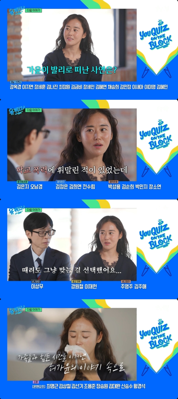 사진=tvN[스포츠투데이김태형기자]그룹포미닛출신허가윤이발리로떠난이유를고백했다.4일방송된tvN'유퀴즈온더블럭'방송말미예고편에는허가윤이등장했다.허가윤은발리에서지낸지3년째라며근황을전했다.그는발리로떠난이유와함께힘들었던한국생활에대한이야기를꺼냈다.허가윤은"학교폭력처럼휘말린적도있었는데그냥맞는걸선택했다"며"아무한테도제가폭식증인걸말못하고먹다가뱃가죽이아파서멈췄다"고고백했다.또한지난2020년세상을떠난오빠를언급하며"오빠가갑자기세상을떠났다.부모님이네가없으면우리도따라가고싶다고말씀하셨다"고눈물을흘렸다.사진=tvN배우신세경의출연도예고됐다.신세경은영화'휴민트'를라트비아에서촬영했다며동료배우들의통역을전담했다고밝혔다.이에조인성이"몇푼챙겨주고싶었다"고말할정도였다고.신세경은"실제로겁이많고조심하는스타일이다.말조심,행동조심.제일상이더블체크다"라고말했다.유재석은"별명이섬세경"이라며신세경의새로운캐릭터를만들어냈다.허가윤,신세경의출연분은11일방송된다.[스포츠투데이김태형기자[email protected]]Copyright©스포츠투데이.무단전재및재배포금지.