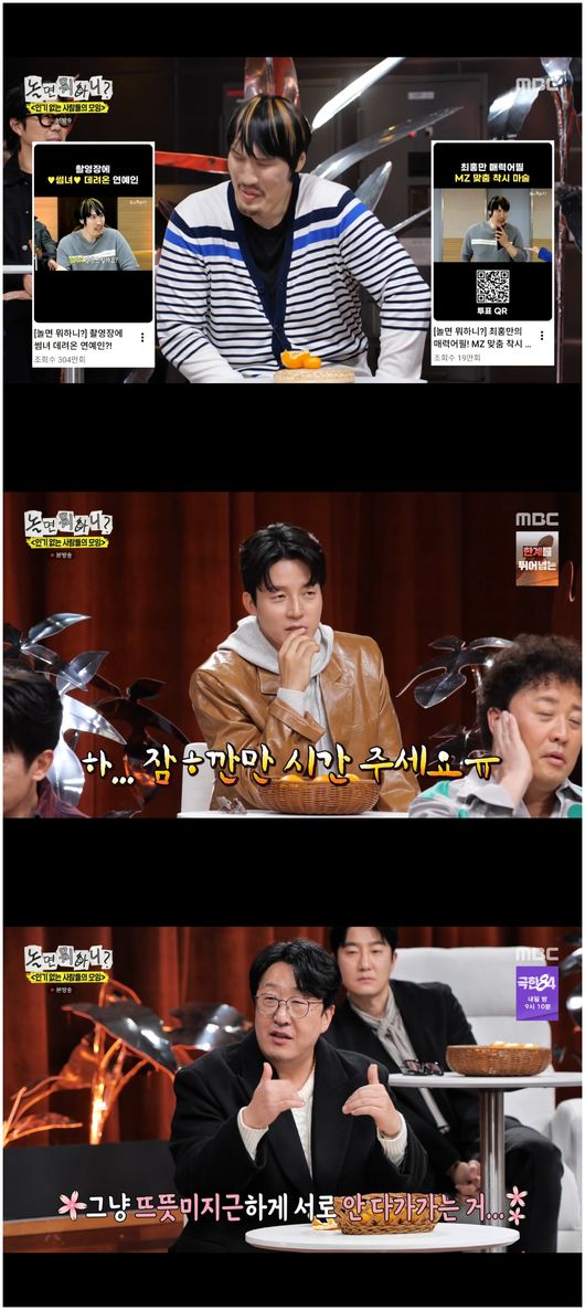 [OSEN=오세진기자]‘놀면뭐하니?’최홍만이지난주방영분으로썸타는상대와한층더깊어졌다고말했다.6일방송된MBC예능‘놀면뭐하니?’에서는'인기없는사람들의모임'이시작됐다.투컷은“제가지난주이후인기가올랐다.그런데타블로형이SNS에도올렸더라.저더러에픽하이덕에인기가올랐다고하는데,저는원래에픽하이다”라며급격히오른인기에대해희비가교차한듯심경을고백했다.투컷만큼대단하게유명해진건최홍만이었다.촬영장에썸녀가함께왔다고말하면서숏폼영상조회수가폭발적으로늘어났던것이다.유재석은“본인영상보다썸녀와의만남영상조회수가많았다”라고말했다.최홍만은“덕분에썸이더깊어졌다.조심스럽지만,더마음이생기게됐다”라며수줍게말했다.허경환은“대체어떤부분이조심스러운거냐.형은전국적으로알려진거아니냐”라며의아해했고,최홍만은발끈하면서도제대로말하지못해웃음을안겼다./[email protected][사진출처]MBC예능‘놀면뭐하니?’Copyright©OSEN.무단전재및재배포금지.