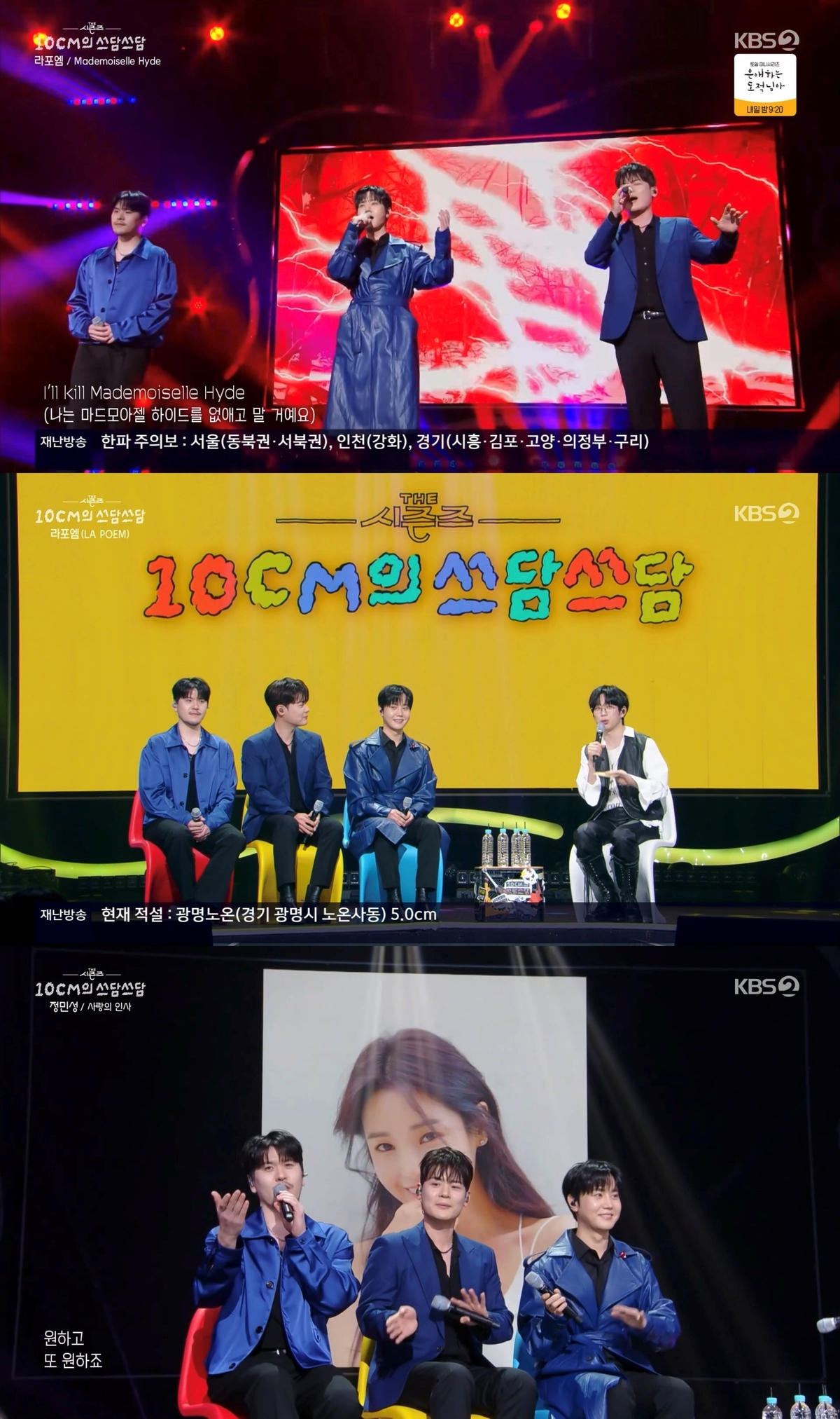 KBS2‘더시즌즈-10CM의쓰담쓰담’방송화면캡처크로스오버그룹라포엠(LAPOEM)이생애첫엔딩요정에도전하며반전매력을뽐냈다.라포엠은지난23일방송된KBS2‘더시즌즈-10CM의쓰담쓰담’에출연해유쾌한토크와탄탄한라이브를선보이며시청자들의이목을사로잡았다.방송에서라포엠은‘지킬앤하이드’를모티브로한라라파비앙(LaraFabian)의‘마드모아젤하이드(MademoiselleHyde)’무대로방송의포문을열었다.오늘날의라포엠을있게한출발점같은곡을무대위에서다시펼쳐보이며단숨에분위기를압도했다.이어진토크에서는라포엠만의차별점이집중조명됐다.멤버들은각자의보컬포지션과음역대를직접들려주며크로스오버그룹으로서의강점을선명하게보여줬다.학창시절즐겨듣던음악과취향을공유한라포엠은자연스러운대화속에서진솔한면모를드러내며시청자들과진한공감대를형성했다.방송말미에는최근발매한미니3집‘얼라이브(ALIVE)’의타이틀곡‘멘트투비(MeanttoBe)’무대를공개하며분위기를더했다.웅장한사운드위로촘촘히쌓인세멤버의흔들림없는보컬이깊은감정선과어우러지며라포엠만의짙은감성을전했다.무대가끝난뒤에는생애첫엔딩요정포즈까지선보이며유쾌한웃음을안겼다.진지하게무대를완성한라포엠은반전미소로마지막까지기분좋은여운을남기며방송을마무리했다.라포엠은오는2월7일과8일양일간단독콘서트‘라포엠심포니:얼라이브인부산(LAPOEMSYMPHONY:ALIVEinBusan)’을개최하고팬들과만남을이어간다.손봉석기자[email protected]©스포츠경향.무단전재및재배포금지.
