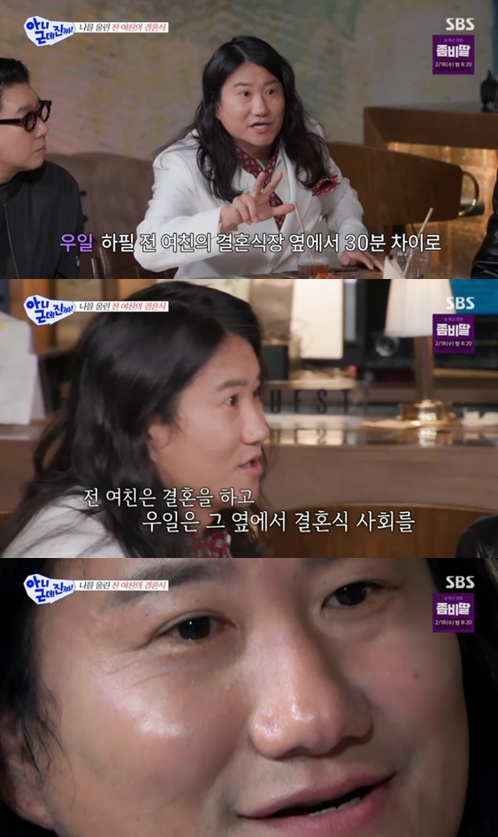 ▲출처|SBS'아니근데진짜'캡처[스포티비뉴스=최신애기자]임우일이눈물이핑도는과거사랑을털어놨다.16일방송된SBS'아니근데진짜'(아근진)에는조현아,이미주,뚜지(이수지)가출연해탁재훈,이상민,엑소카이와'3:3미팅'토크쇼를진행했다.이날임우일은"결혼식사회를갔는데바로1km앞에서전여친이결혼을했다"고밝혀안타까움을안겼다.임우일은"그친구때문에개그맨이됐었다.20대때그친구를만날때날더라늘재밌다고했다.개그맨을해보라고했다.그러고못견디고떠났다"며먹먹해했다.이어임우일은"한번은제가연극으로한달에20만원받을때였다.친구8명을(내가하는연극을보러)데리고왔었다.연극끝나고밥을먹으러갔었다.그런데'우일이가대접할것'이라고하더라.그래서내가속으로'얘미쳤나'했다.이별통보인줄알았다.그런데그친구가계산서밑으로안보이게내게(자신의)카드를줬다"며감동사연을털어놨다.임우일은"그친구가결혼을하는데,다른친구들이장난친다고청첩장을보냈다.바로옆홀에서30분차이로제가결혼식사회를하게됐다.신랑,신부입장을하는데기분이정말이상하더라.그날와서술을마시고혼자코인노래방을갔다.노래를부르면서눈물이터졌다"고전했다.실제로임우일은해당곡을부르다가이날도눈가가촉촉해져눈길을끌었다.또한임우일은"(그친구와)헤어지고나서교회에서기도를했다.제발다음에정말사랑하는여자친구는제가준비가됐을때나타나게해달라고기도했다.그런데오늘두어분정도나타난것같다"고해조현아와이미주를경악케했다.<저작권자ⓒSPOTVNEWS.무단전재및재배포금지>Copyright©스포티비뉴스.무단전재및재배포금지.