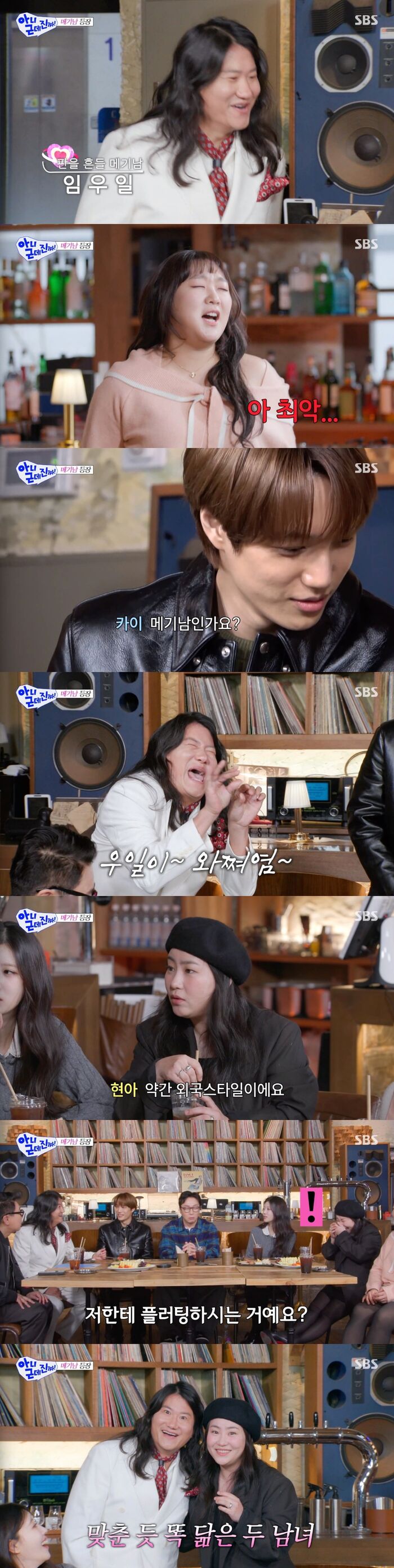 조현아가임우일과똑닮은외모로눈길을끌었다.16일방송된SBS'아니근데진짜'에서는이미주와조현아,뚜지가3대3미팅을했다.이날카이와탁재훈은뚜지의등장에깜짝놀랐다.두사람은"저분은또왜왔냐?돈받았냐?"라며물었다.그러자주선자이상민은"뚜지는늘온다"라고둘러댔다.이에뚜지는어깨를노출시키며매력발산을했다.하지만이행동은모두를기함하게만들어폭소를자아냈다.그리고곧남자메기가등장했다.임우일의등장에카이는"메기남인가요?"라고했고,탁재훈은"진짜메기가온건가요?"라고물어웃음을자아냈다.또한뚜지는먹던것까지뱉어내며폭풍적인반응을보여눈길을끌었다.조현아는임우일에대해"약간외국스타일이다"라고했다.그러자임우일은"저한테플러팅하시는거냐,꼬마아가씨귀엽네"라며플러팅을했다.그리고이를본뚜지는"두분그림체가잘맞아요"라고했다.이에조현아는실제로임우일을닮았다는말을많이들었다고했다.실제로비교한두사람은맞춘듯똑닮은얼굴로눈길을끌었다.(SBS연예뉴스김효정에디터)Copyright©CopyrightⓒSBS.Allrightsreserved.무단전재,재배포및AI학습이용금지