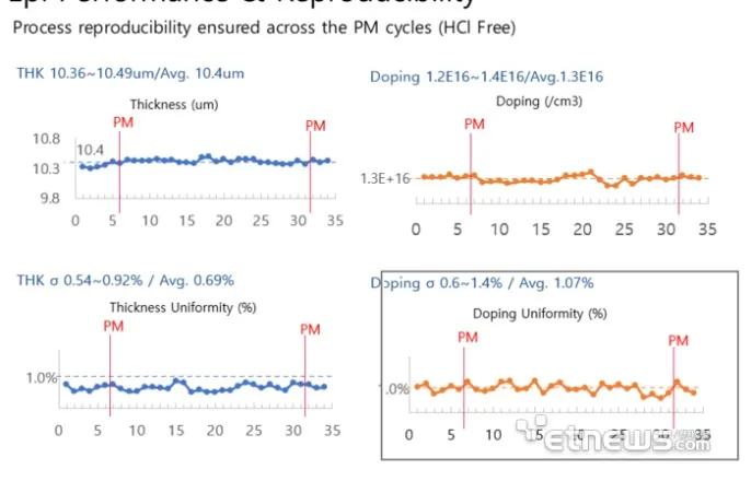 테스'튜너블트리플페어노즐(TunableTriplePairNozzle)'을통한질화알루미늄(AlN)에피공정의두께균일도테스트결과.〈자료=테스〉국내반도체장비기업테스가외산장비가독점해온화합물반도체장비'에피시스템(EpiSystem)'시장에승부수를던졌다.18일업계에따르면테스는최근고구조적안정성과열방출특성이뛰어난질화알루미늄(AlN)에피공정의기술적검증을완료,'질화갈륨(GaN)에피시스템'양산준비를완료했다.화합물반도체는한가지원소(실리콘)로만이루어진일반반도체와달리두종류이상원소를섞어만든반도체를뜻한다.고온·고전압에강해전기차,통신장비에활용도가높다.주로실리콘(Si)위에탄화규소(SiC)나질화갈륨(GaN)을얇게층을쌓아만든다.저궤도(LEO)위성이나드론,군용레이더장비에는고주파(RF)모듈이들어가는데,이모듈에는열에강한화합물반도체가필수다.특히'고성능GaNRF고전자이동도트랜지스터(HEMT)'소자에는절연성과열방출이뛰어난AlN이필요하다.실리콘웨이퍼위에탄화규소나질화갈륨을쌓으면원자크기와배열간격이서로맞지않아층이뒤틀리거나금이가기쉽다.이를방지하려면질화알루미늄을중간에끼워넣어완충작용을해야하는데,이과정에서균일도를확보하는것은가스를원자단위로통제해야하는매우고난이도기술이다.특히반도체원료가되는여러가스가웨이퍼에닿기전에섞이는'믹스존(MixZone)'해결이어렵다.웨이퍼에도달하는가스의양이불균일해져반도체품질이망가진다.테스는이문제를독자적인가스제어기술'튜너블트리플페어노즐(TunableTriplePairNozzle)'을통해해결했다.수직대신수평형(Horizontal)으로노즐구조를설계해가스끼리섞이는문제를최소화했다.또한상·하로구성된노즐의독립제어를통해균일도를높였다.테스내부테스트결과,별도의레시피수정없이34회연속공정(Run)을진행했음에도불구하고동일한품질의결과물을얻어냈다.별도의레시피튜닝없이도예방정비(PreventiveMaintenance)이후동일한결과물이나와공정재현성도뛰어난것으로나타났다.테스는이미지난해자사SiC장비를통해두께균일도를8인치기준1%이하수준(THK평균0.69%)으로유지하는데성공한바있다.이는글로벌티어장비사들공식기술사양서기준(1.5%이하)과대등하거나오히려앞선수치다.테스는최근GaNRF국내외주요고객사를대상으로데모(Demo)장비공급을조율하면서동시에독일소재주요기술연구소와기술검증과정을진행하고있다.테스관계자는“화합물반도체성장장비분야에서15년동안축적해온기술력이이제본격적인결실을맺을시점”이라고말했다.이형두기자[email protected]©전자신문.무단전재및재배포금지.
