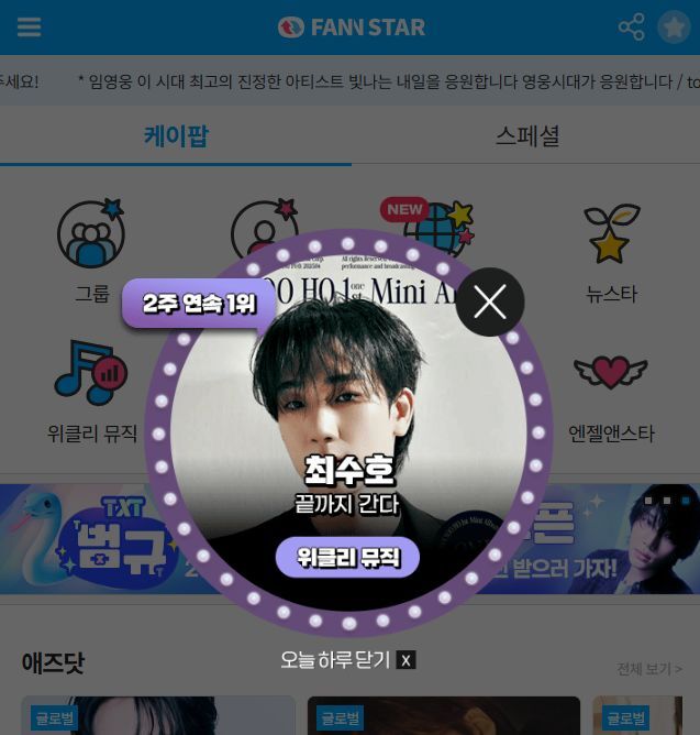 '팬앤스타'5월첫째주위클리뮤직투표에서77만7195득표지난5일가수최수호가'팬앤스타'위클리뮤직차트1위를차지했다./팬앤스타[더팩트|이나래기자]가수최수호가주간아이돌랭킹사이트'팬앤스타'위클리뮤직2주연속1위에올랐다.최수호는지난28일부터5일까지진행된'팬앤스타'5월첫째주위클리뮤직투표에서77만7195표를얻으며1위에올랐다.이어투모로우바이투게더범규가74만7736표를얻으며2위를차지했고박창근은8만8966표로3위에이름을올렸다.'팬앤스타'위클리뮤직은신규음원을발매한아티스트가후보에진입한다.5주연속1위를하고누적투표수300만표를달성하면홍대역에위치한대형전광판을통해이소식을축하한다.최수호의1위소식과함께투표에참여한팬들이'팬앤스타'공식문자메시지함으로축하인사를보냈다.닉네임'러브수호랑'은"최수호님의목소리끝까지응원합니다"라고전했다.한편'팬앤스타'는<더팩트>에서운영하는주간아이돌랭킹사이트로,아이돌투표및전광판서포트를진행하며팬덤의놀이터로통한다.그룹랭킹과솔로랭킹,뉴스타,위클리뮤직투표는매주월요일시작되며아이돌을좋아하는팬이라면누구나참여할수있다[email protected]발로뛰는더팩트는24시간여러분의제보를기다립니다.▶카카오톡:'더팩트제보'검색▶이메일:[email protected]▶뉴스홈페이지:http://talk.tf.co.kr/bbs/report/writeCopyright©더팩트.무단전재및재배포금지.