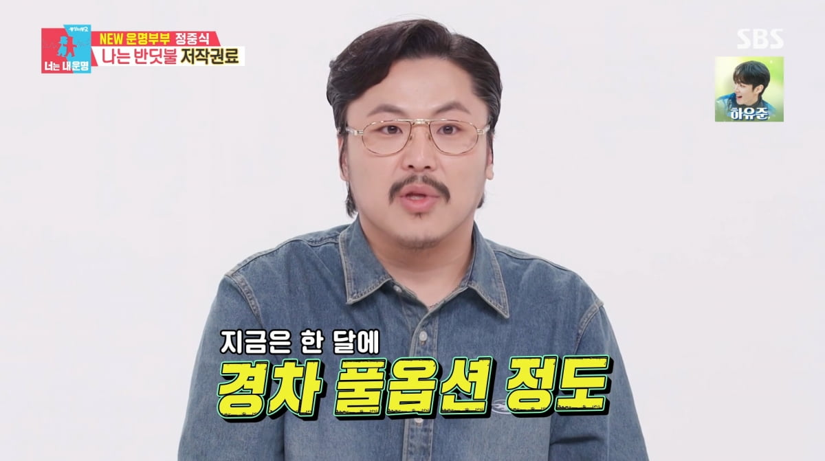 SBS‘동상이몽2너는내운명’캡처SBS‘동상이몽2너는내운명’캡처[뉴스엔유경상기자]정중식이‘나는반딧불’저작권료를밝혔다.5월5일방송된SBS‘동상이몽시즌2-너는내운명’에서는가수황가람의‘나는반딧불’원곡자정중식이출연했다.중식이밴드는‘슈스케7’TOP4까지진출한전적이있었고서장훈은“육중완과장기하가섞여있는것같다”고평했다.‘나는반딧불’대박이나며현재정중식은저작권부자.한달저작권료를묻는질문에정중식은“월급처럼인지하실수있는데그렇지않다.계속만원,20만원.다른일안하고먹고살수있을정도로들어오다가경차풀옵션정도들어온다.한달에”라고밝혔다.김숙이“매달소형차한대사는거랑똑같다”며감탄하자정중식은“지금다른나라까지팔려나가고있다.저작권동의서써달라고해외에서도연락이온다”고희소식도전했다.이지혜가“한가람,정중식도인생역전”이라며감탄했고정중식은“네,덕분에”라며인정했다.(사진=SBS‘동상이몽2너는내운명’캡처)뉴스엔유경상yooks@기사제보및보도자료[email protected]ⓒ뉴스엔.무단전재&재배포금지Copyright©뉴스엔.무단전재및재배포금지.