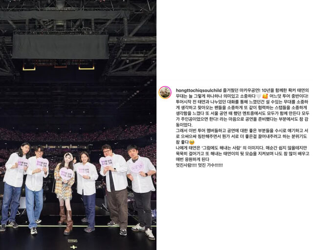 밴드마스터홍또치가전한태연의아티스트로서의진정성"태연이는정말진국"팬과DM에서전한진심밴드마스터홍또치(왼쪽에서네번째)가태연을향한애정을담은글을게재했다./홍또치인스타그램[마이데일리=차재연인턴기자]가수태연을향한스태프의진심어린메시지가팬들에게감동을전하고있다.밴드마스터홍또치(본명홍소진)는지난달29일자신의인스타그램을통해"10년을함께한로커태연의무대는늘하나하나의미있고소중하다.투어시작전태연과나누었던대화를통해설수있는무대를소중하게생각하고찾아오는팬들을소중하게또같이협력하는스태프들을소중하게생각함을느꼈다"고밝혔다.이어"서울공연때했던멘트중에서모두가함께만든다모두가주인공이었으면한다!라는마음으로공연을준비했다는부분에서도참감동이었다.그래서이번투어멤버들하고공연에대한좋은부분들을수시로얘기하고칭찬해주면서서로더좋은걸끌어내주려고하는분위기도참좋다"고전했다.특히그는태연을'그럼에도해내는사람'이라고표현하며"매순간쉽지않을테지만묵묵히걸어가고또해내는태연이의뒷모습을지켜보며나도참많이배우고매번응원하게된다.멋진사람!!!!멋진가수!!!!!!"라며깊은애정을드러냈다.팬과의DM에서전해진홍또치의태연에대한진심./X(옛트위터)'출구없태연'태연을향한진심은팬과의개인메시지에서도확인됐다.한팬이공개한DM에서"제가10년간지켜봐온태연이는...정말진국입니다!ㅠㅠ너무소중한동생이고멋진아티스트임에틀림이없죠!그럼에도무대를즐기면서최고의공연으로팬들에게보여주고싶어하는모습에이번에한번더배웠네요.계속함께응원해요"라고말해팬들을뭉클하게했다.홍또치는태연의솔로앨범편곡및연주에참여해온음악파트너다.태연콘서트라이브세션키보디스트로도잘알려져있다.진심이담긴그의따뜻한글이전해지며아티스트로서의태연의진정성과인간적인면모가다시한번주목받고있다.그룹소녀시대멤버태연마카오단독콘서트./SM엔터테인먼트제공한편,태연은4월19~20일일본도쿄아리아케아레나에서단독콘서트를개최할예정이었으나공연이틀전인17일소속사SM엔터테인먼트는돌연공연취소를알렸다.SM측은"아시아투어에서사용하는기재를일본을향해수송중이나현시점에도일본에도착하지않고있고,공연실시를향한충분한준비를하는것이매우곤란한상황"이라며"모든가능성을모색해왔지만만전의상태로공연을개최하는것이어렵다고하는판단에이르렀다"고설명했다.이에태연은글로벌팬연합이발표한'TheTENSE도쿄취소사태에대한피드백및보상촉구성명서'를인스타그램에공유했다.팬소통플랫폼을통해"모두의노력과기대감으로만들어진내공연이한순간에날아가버리고도둑맞은느낌"이라며소속사의미흡한대응을강하게비판했다.Copyright©마이데일리.무단전재및재배포금지.