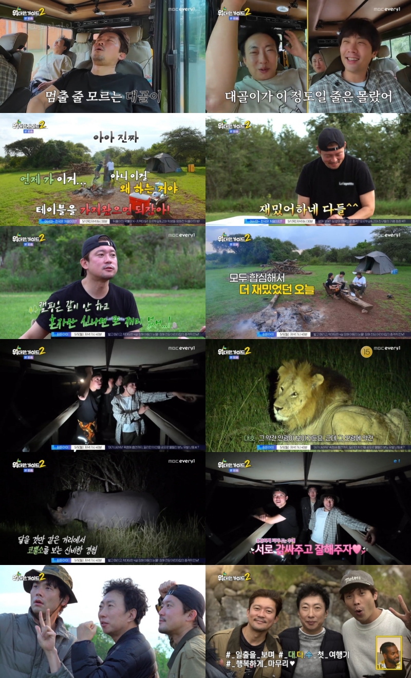 ‘위대한가이드2’박명수,김대호,최다니엘의꿀케미아프리카르완다여행이마무리됐다.iMBC연예뉴스사진4월29일방송된MBC에브리원‘위대한가이드2’에서는박명수X김대호X최다니엘대.다.수3인방의르완다여행마지막편이공개됐다.세사람은광활한야생속에서캠핑을하고,칠흑같은어둠을뚫고나이트사파리에도전하는등마지막까지버라이어티한여행을즐겼다.이과정에서한층더가까워진대.다.수3인방의케미가웃음을빵빵터뜨린동시에뭉클함까지선사했다.이날대.다.수3인방은야생속캠핑을위해자동차로4시간거리에있는르완다최대규모국립공원아카게라를찾았다.이동부터심상치않았다.김대호가역대급코골이를해‘대골이’라는NEW별명을얻는가하면,하늘에서갑자기비가쏟아진것.특히여행내내자리운이없었던박명수는틈새로새는빗물때문에당황해웃음을자아냈다.그렇게아카게라에도착한대.다.수3인방은입구에서부터야생개코원숭이무리를마주했다.이어구름이걸려있을정도로높은곳에위치한캠핑사이트에도착하자입을떡벌리며감탄을쏟아냈다.탁트인하늘,드넓은땅등경이로운대자연에도파민이제대로터진것.특히한국에서부터캠핑을고대한‘캠핑광’김대호는흥분을감추지못했다.그렇게기대속에시작된캠핑은예상밖대환장이었다.무엇보다통나무로자연식탁을만드는과정에서세남자의몸개그가폭발했다.하필땅에내려놓은통나무가뒤집어는일명‘빽도’사태가발생한것.세남자도결국웃음을빵터뜨렸다.중간에장대비가쏟아지며촬영이중단되기도했으나김대호만은“난좋은데?”라며텐션을잃지않았다.고난의캠핑,저녁준비였지만세남자는역대급저녁만찬을즐겼다.김대호가형,동생의취향을저격하는메뉴를만든것.서울에서가져온소주로고기의비린내를잡고한식당에서공수한김치로갈비김치찌개도만들었다.‘믿고먹는’르완다감자로만든감자채전은극강의맛이었다.진짜맛있게먹는세남자모습에스튜디오패널들도군침을꼴깍삼켰을정도.이어이들은성공률30%라는나이트사파리에도전했다.긴장,공포,스릴등을만끽하며칠흑같은어둠을달린세남자는야생사자무리와마주했다.세남자의눈이번쩍뜨인순간이었다.또한만나기어렵다는야생코뿔소도봤다.대자연의경이로움에대.다.수3인방은크게감격했다.박명수는“우리가잘맞나봐.서로감싸주고잘해주자”라고급훈훈한멘트를날려웃음을줬다.그렇게캠핑사이트로돌아온세사람은여행마지막날한텐트에서옹기종기누워잠들었다.다음날김대호는시장에서사온르완다원두로박명수,최다니엘을위해커피를내렸다.그렇게커피를마시며아프리카일출을본세남자는“이이상은없다”,“울컥한다”라고말했다.‘위대한가이드2’의포문을연르완다여행은시즌최초현지인가이드가동행하지않은여행이었다.대신현지인가이드모세는세세하게가이드북을만들어줬고,대.다.수3인방은이가이드북과함께직접부딪히며르완다를만끽했다.많은현지인들이이들의여행의길라잡이가되어주었다.덕분에세남자의여행만족도는최상이었다.여행예능이주는대리만족,리얼버라이어티의재미가동시에터진‘위대한가이드2’르완다편이었다.한편이날방송말미‘위대한가이드2’두번째여행지아르헨티나편예고가공개됐다.박명수,최다니엘과새로합류한막내이무진이무려44.835km를이동해지구반대편아르헨티나를여행을즐기는모습이었다.더버라이어티하고더특별한여행을보여줄아르헨티나편이기대된다.MBC에브리원‘위대한가이드2’는매주화요일저녁8시30분방송된다.iMBC연예유정민|사진출처MBC에브리원Copyright©MBC연예.무단전재및재배포,AI학습금지.