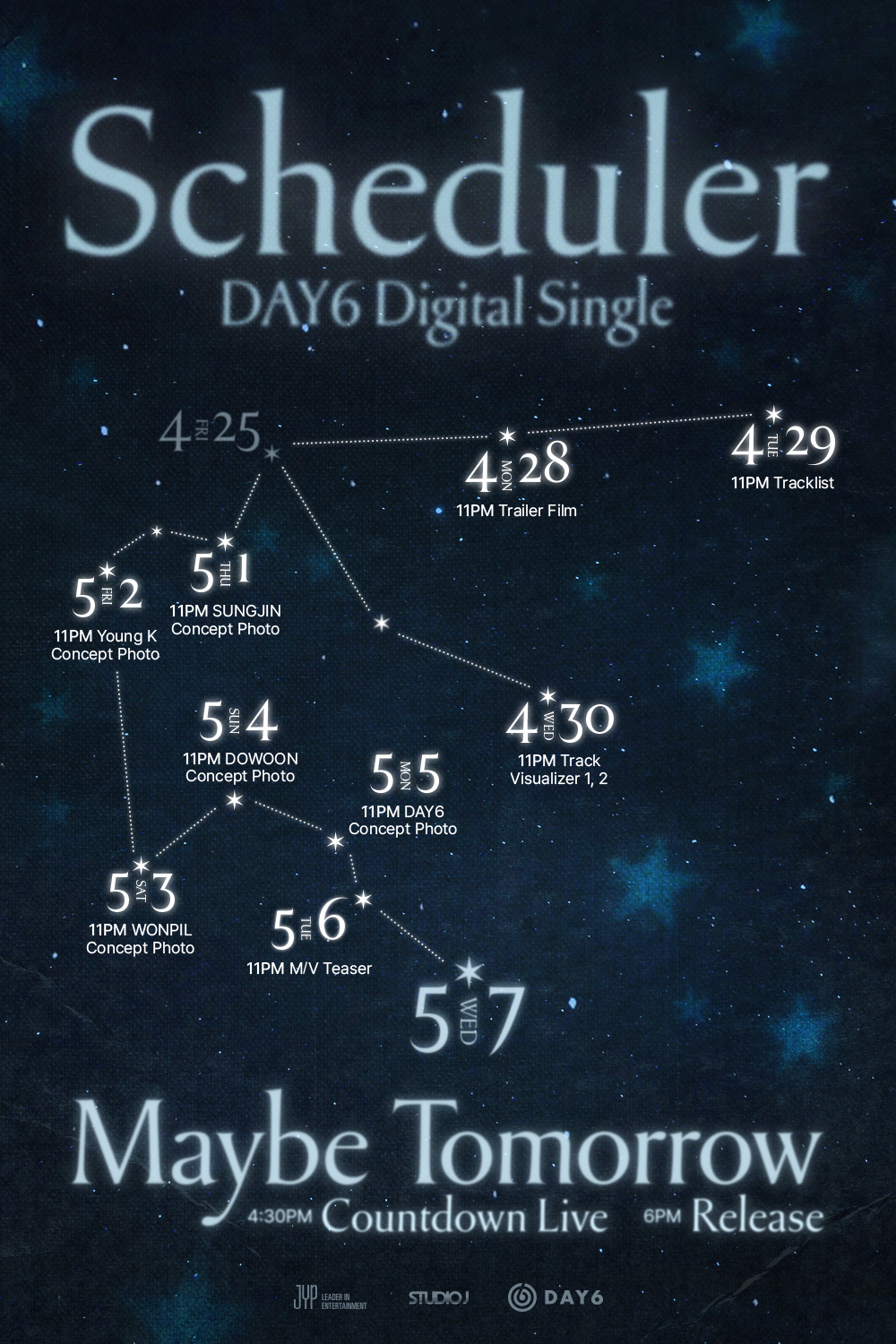 데이식스데이식스데이식스(DAY6)가동화속으로들어와있는듯한컨셉트포토로컴백에대한기대감을높였다.데이식스는5월7일새디지털싱글'메이비투모로우(MaybeTomorrow)'를발표한다.지난해9월미니앨범'밴드에이드(BandAid)'와타이틀곡'녹아내려요'이후8개월만에선보이는곡이다.데이식스데이식스소속사JYP엔터테인먼트는공식SNS채널에개인포스터4종과스케줄러를게재했다.성진,영케이,원필,도운네멤버는희망찬내일을앞두고꿈속을여행하는듯한모습을동화처럼표현했다.밤하늘을수놓은스케줄러에따르면28일트레일러필름,29일트랙리스트,30일트랙비주얼라이저부터5월6일뮤직비디오티저등다양한콘텐트를오픈한다.5월7일오후4시30분에는카운트다운라이브를열고팬들과소통한다.데이식스는신곡발매에이어5월9일~11일과16일~18일서울송파구올림픽공원KSPO돔에서전세계23개지역45회규모의월드투어피날레를장식한다.공연은총6회전회차전석매진을기록해압도적인티켓파워를실감케했다.26일~27일엔요코하마,5월3일자카르타등지를찾아단독공연을열고현지관객과만난다.정하은엔터뉴스팀기자[email protected]사진=JYP엔터테인먼트Copyright©JTBC.무단전재및재배포금지.