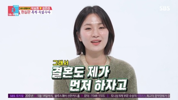 '동상이몽2-너는내운명'21일방송SBS'동상이몽2'캡처SBS'동상이몽2'캡처(서울=뉴스1)박하나기자=전쇼트트랙,스피드스케이팅국가대표박승희가남편에게먼저고백했다고밝혔다.21일오후방송된SBS예능프로그램'동상이몽2-너는내운명'(이하'동상이몽2')에서는새로운운명부부박승희-엄준태의일상이담겼다.빙상계의전설박승희,5살연상의가방브랜드CEO엄준태부부가새로운운명부부로합류했다.두사람은지인이연모임에서처음만나친해져연인으로발전했다고밝혔다.박승희는"고백은제가했다,답답해서"라며"기다리는게너무답답했다,누가봐도서로좋아하는게너무티가나는데"라고고백해모두를놀라게했다.연애4개월만에상견례를했다는두사람.박승희는"그당시에는어차피결혼할거같은데할거면빨리하자는생각에결혼도제가먼저하자고했다"라고덧붙여눈길을끌었다.한편SBS'동상이몽2'는다양한분야의커플들이알콩달콩살아가는모습을'남자'와'여자'입장에서바라보고,운명의반쪽을만난다는것의의미와두사람이함께사는것의가치를살펴보는프로그램으로매주월요일오후10시10분에방송된다[email protected]©뉴스1.Allrightsreserved.무단전재및재배포,AI학습이용금지.
