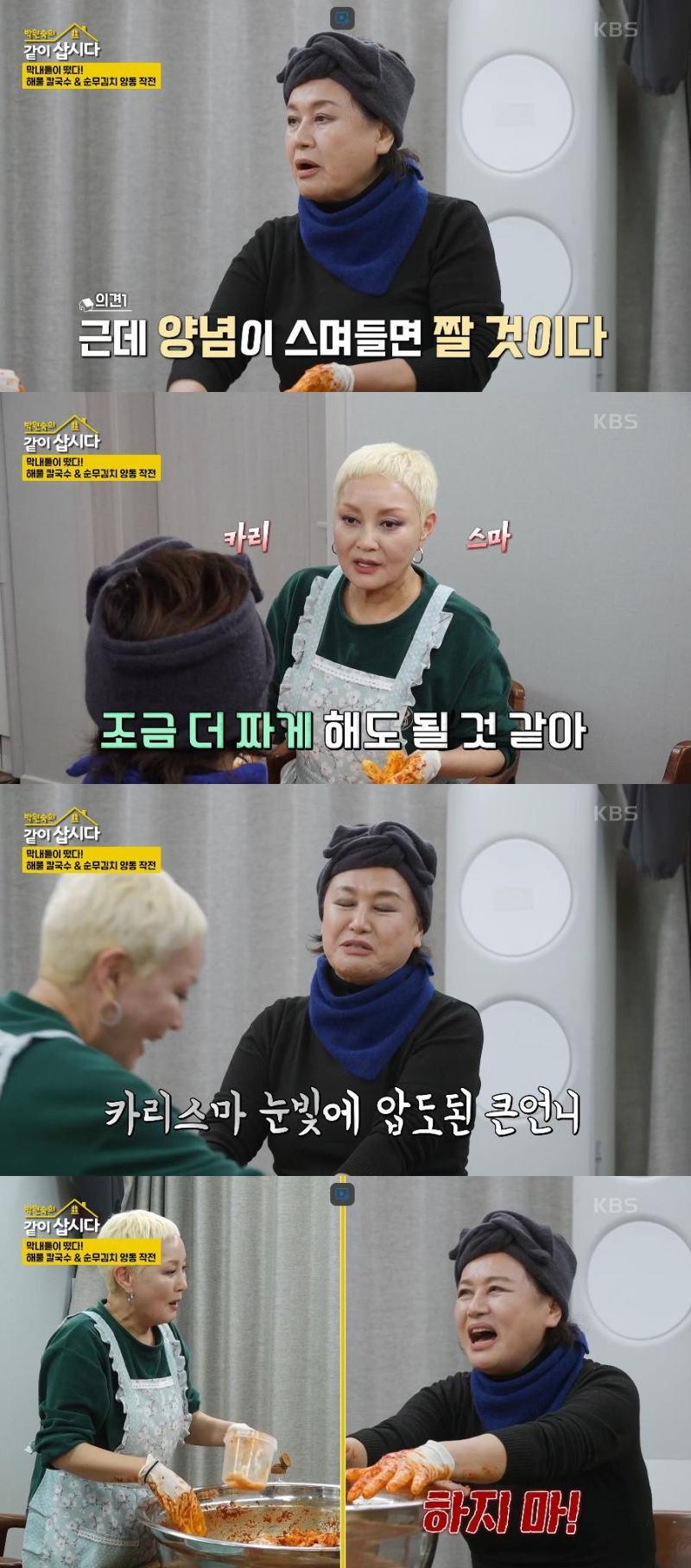 사진=KBS1‘박원숙의같이삽시다’방송캡처.박원숙과홍진희가‘순무김치’담그기를두고의견차이를보였다.21일방송된KBS1‘박원숙의같이삽시다’(이하‘같이삽시다’)에서는박원숙과홍진희가대용량순무김치담그기에도전한다.순무김치의매운양념을중화시켜줄채수를투입하는홍진희.이를본박원숙은“우리진희솜씨좋다”며감탄한다.그것도잠시,순무김치의맛을본박원숙은“조금싱거운것같다.그런데양념이스며들면서나중에는짤것같다”고의견을낸다.그러나홍진희는“조금더짜게해도될것같다”고팽팽하게대립,홍진희의단호한눈빛을본박원숙은“네의견이그렇다면그렇게해.눈좀동그랗게보지마”라며웃는다.이후홍진희는본격적으로양념을투입,행녀나김치의양념이강해질까봐걱정된박원숙은“하지마!”라며홍진희를말린다.홍진희는“언니발뺌하려고그러는거지”라며티격태격케미스트리를보인다.이후제작진과의인터뷰에서박원숙은“친자매끼리는막대하지않냐.(진희랑은)친한사이를넘어친자매같은사이가됐다”며“진희가대드는것처럼보여도근본을알아서그런지마음의상처자괘씸한게없다.의견을얘기하는게오히려좋다”고애정을드러낸다.김지혜기자[email protected]©일간스포츠.무단전재및재배포금지.
