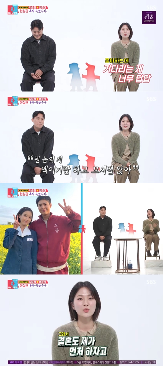 ▲출처|SBS'동상이몽2-너는내운명'캡처[스포티비뉴스최신애기자]현실판'폭싹부부'의탄생이다.21일방송된SBS'동상이몽2-너는내운명'에는'빙상여제'박승희와엄준태부부가첫출연해현실판'폭싹속았수다'의정석을보여줬다.이날엄준태는"저는가방산업CEO다"라며현재하고있는일을밝혔다.이에박승희는"저희는5살차이다"라고덧붙였다.다시엄준태는두사람의첫만남에대해"아는누나분과모임을하게됐는데그자리에서처음만났다.모임활동을하면서제대로친해지게됐다"고전했다.이에박승희는"내가고백을먼저했다.답답해서"라고밝혀놀라움을안겼다.박승희는"좋아하는데기다리는게너무답답했다.누가봐도서로좋아하는게티가날정도였는데너무고백을안해서내가먼저했다"고밝혔다.특히박승희는"'폭싹속았수다'에서보면애순이가관식이한테'뭔놈의남자가먹이기만하고꼬시질않아'라고했는데그대사가딱우리였다.답답한걸못참는제가먼저고백하게됐다"며'폭싹부부'의탄생을알렸다.이어"4개월뒤에상견례를했다.어차피결혼할건데할거면빨리하자싶었다.결혼도제가먼저하자고했다"고밝혀놀라움을안기는한편,"남편이정말관식이처럼무쇠같은남자다.알짜배기같은남자라서결혼을생각하게됐다"며남다른애정을드러냈다.<저작권자ⓒSPOTVNEWS.무단전재및재배포금지>Copyright©스포티비뉴스.무단전재및재배포금지.