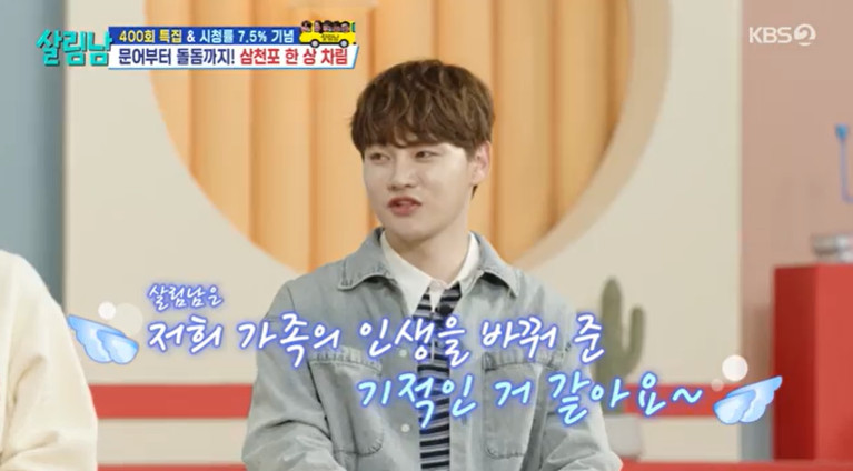 KBS2TV'살림하는남자들시즌2'19일방송KBS2TV'살림하는남자들시즌2'(서울=뉴스1)김보기자=가수박서진이'살림하는남자들시즌2'프로그램을통해가족이변화했다고밝혔다.19일오후방송된KBS2TV'살림하는남자들시즌2(이하'살림남')'에는멤버들이'살림남'400회를축하하는장면이공개됐다.이날지상렬은박서진의아버지에게"'살림남'하며'이때내가절대잊지못한다'하는추억이있냐"고물었다.그러자박서진의아버지는"시청률7.5%찍은날"이라며박서진에게염색을받았던날을회상했다.이에박서진또한"평생남을기억이다"라고말했다.그러면서박서진또한'살림남'을하며가장기억에남는순간을떠올렸다.박서진은"마음상담받았던날"을꼽았다.그러면서"당시에는이게정말효과가있겠느냔생각했었는데끝나고나니까가족들변화가눈에보이고확바뀐게실감이났다"고말했다.이에박서진의어머니는"특히내가많이바뀌었다,평소에는행사갔다오면전화도안했는데이제콘서트하면'서진아,엄마집에잘왔다,고생했어'라고전화한다"고밝혔다.박서진은이에대해"'살림남'이단순하게프로그램이아니라우리가족의인생을바꿔준기적같다"고말했다[email protected]©뉴스1.Allrightsreserved.무단전재및재배포,AI학습이용금지.