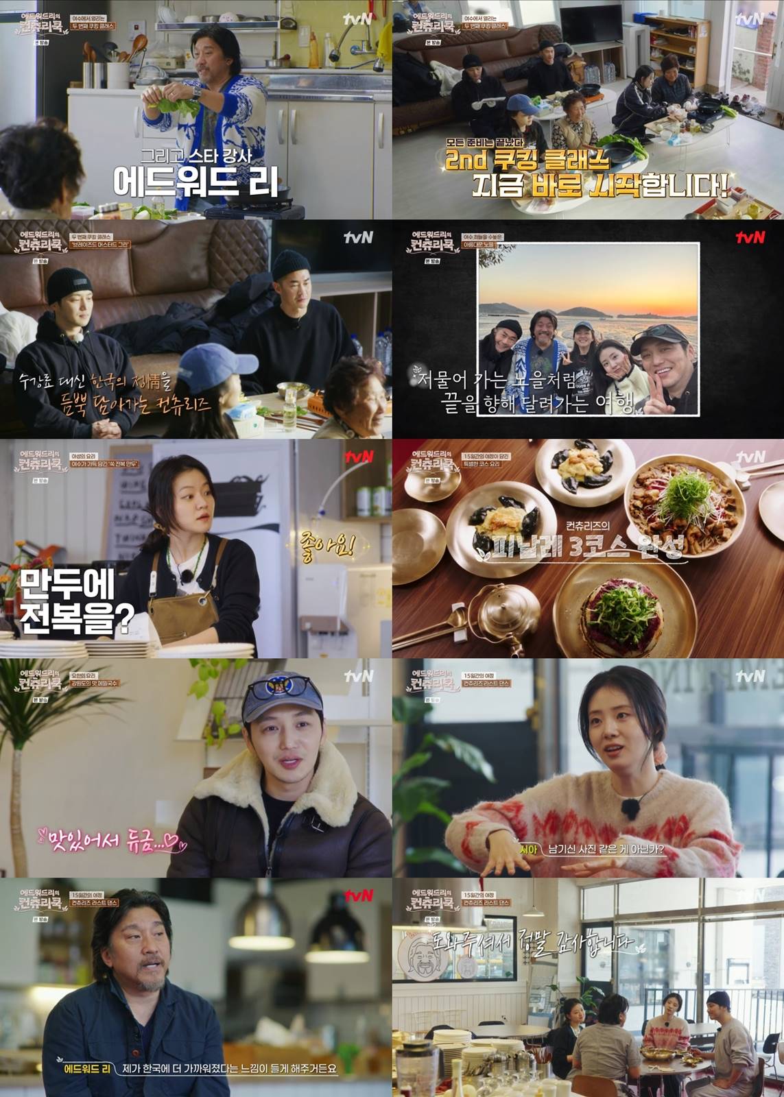 한국의맛과문화를섭렵하며힐링을선사했던‘에드워드리의컨츄리쿡’이종영됐다.iMBC연예뉴스사진지난18일(금)방송을끝으로막을내린tvN‘에드워드리의컨츄리쿡(연출김관태)’에서는한국의제철식재료와음식을찾아떠난컨츄리즈가그어떤조미료도흉내낼수없는손맛과따뜻한정을느끼며잊지못할추억의한페이지를장식했다.먼저에드워드리가변요한,고아성,신시아와함께강원도,안동,여수에서다양한식재료를접해눈길을끌었다.강원도에서는대왕문어와양미리,메밀,황태,나물,안동에서는딸기,안동찜닭,간고등어,여수에서는돌게장,쑥디저트,군평선이,홍어,갓등을맛봤다.또한각지역에서의경험을통해영감을얻은에드워드리는창의적인요리를선보이며탄성을자아냈다.물없이삶은문어를구워씨앗젓갈이들어간젓갈치미추리소스와먹는‘味(미)친추리문어구이’,된장,두유,닭,막걸리를넣고끓여잣으로마무리한‘두유라이크된장닭’,딸기소스를곁들인퓨전호떡등번뜩이는아이디어가담겨흥미를끌었다.컨츄리즈는여정동안음식뿐만아니라온정이넘치는사람들과마음을나누기도했다.특히학가산메주마을방문당시에드워드리는할머니들이준비한달래된장찌개와고봉밥,가마솥에익힌수육까지푸짐한밥상에서그리워했던할머니의손맛을느끼고눈물을흘려보는이들을먹먹하게했다.에드워드리도한식을주로드시는할머니들을위해베이컨잼이들어간수제버거를스페셜새참으로선물해훈훈함을배가시켰다.뿐만아니라강원도감자로뇨키를만들었고,여수갓으로미국식삶은갓찜인브레이즈드머스터드그린을만들어보는쿠킹클래스를열어재미를선사했다.선생님으로변신한에드워드리를필두로변요한,고아성,신시아가어르신들을도우며친숙한식재료를색다르게즐기는레시피를전수해의미를더했다.유쾌하고호기심많은에드워드리와그의든든한동생으로열정서포트한변요한,꼼꼼한똑쟁이고아성,먹방최강자‘먹시아’신시아까지멤버들의각양각색캐릭터와하루가지날수록더욱돈독해지는이들의관계가즐거움을안겼다.더불어컨츄리즈는게스트로출연한윤두준,배정남과도유쾌한케미스트리를발산했다.한편,마지막회에서는에드워드리가이번여정에서얻은아이디어와추억이담긴식재료를사용해색다른요리레시피를준비했다.특별한마지막식사를위해여행동안요리실력이성장한변요한,고아성,신시아가메밀국수,쑥전복만두,7층밥케이크를맡았고에드워드리와함께요리를완성했다.마지막만찬은환상적인맛과여행의기억을떠오르게하며감성도잡았다.에드워드리는“제가어렸을때는(정체성이)미국인90%,한국인10%같았다.이여행이끝나가면서어쩌면한국인70%,미국인30%일지도모르겠다는생각도든다”고말했다.그런가하면변요한은“(제가)첫날에오지못해서못먹었던음식들을형과함께만들면서제가없었던시간을같이채워주는느낌이었다.그마음이되게감사했다”고진심을밝혔다.고아성은“과일이요리에들어가는걸정말안좋아했다.근데셰프님이제가가지고있던편견을확깨주신것같다”,신시아는“실패든성공이든그게다과정이라고하셨다.(요리하는)과정을즐기는방법을배우게된것같다”고소감을전했다.iMBC연예김혜영|사진출처tvNCopyright©MBC연예.무단전재및재배포,AI학습금지.