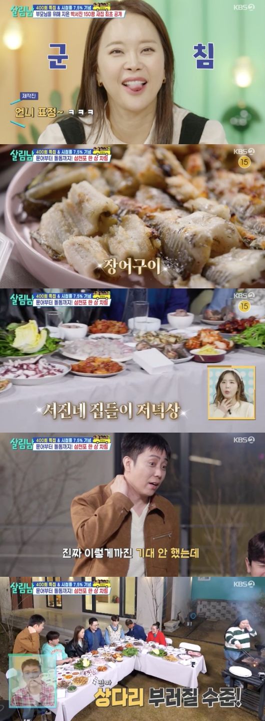 [OSEN=임혜영기자]박서진의대저택마당에서파티가열렸다.19일방송된KBS2TV'살림하는남자들시즌2'(이하'살림남’)에는삼천포를찾은'살림남'가족들의이야기가그려졌다.드디어모두가박서진의집에모였다.먼길을와준손님들을위해150평대저택마당에커다란식탁이차려졌다.식탁위에는제철회,돌문어,낙지호롱이,장어구이,해삼,멍게,개불등어마어마한메뉴들로가득찼다.은지원은“이렇게까지기대안했는데”라며감탄했고백지영도“상다리가부러지겠다”라고말하며행복한표정을지었다.박서진은“먼길와주셔서감사드린다.건배사는‘상한가’로하겠다.‘상심하지말고한탄하지말고가슴을펴라’”라는건배사를외쳤다./[email protected][사진]KBS2TV'살림하는남자들시즌2'Copyright©OSEN.무단전재및재배포금지.