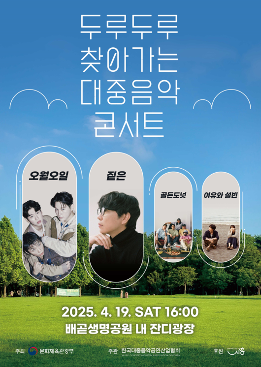 [OSEN=김채연기자]한국대중음악공연산업협회(이하음공협)가주도하는‘두루두루찾아가는대중음악콘서트’가오는4월19일경기도시흥시의배곧생명공원내잔디공원에서열린다.음공협측에따르면이날공연에는기분좋아지는노래,혼자듣기아까운감성노래,인디밴드'오월오일’,음악으로그리는한폭의유화'짙은’,따뜻한사운드와개성넘치는브라스밴드‘골든도넛’,감성적인하모니와힐링무대‘여유와설빈'이출연하여‘푸른자연속에서여유롭게즐기는감성충만음악축제!’라는부제로감성충전힐링무대,즐거움가득콘셉트로진행될예정이다.'두루두루찾아가는대중음악콘서트'는전국순회무료공연프로그램의일환으로4월말까지총13회에걸쳐전국각지의문화소외지역을찾아공연을이어간다.공연은전석무료로진행되며,지역민들에게음악을통한문화향유의기회를제공하고자기획됐다.앞서지난4월둘째주개최된경기도오산공연(실내공연)에이어,강원도삼척공연(페스티벌형식야외공연)은다채로운프로그램과관객들의뜨거운반응속에성황리에마무리됐다.한편한국대중음악공연산업협회는콘서트,페스티벌,월드투어,내한공연등다양한대중음악공연을주최∙주관하고있는총43개사의협회원사로구성되어있으며,대중음악공연산업의미래와종사자의권리를위해협력하는사단법인단체이다./[email protected][사진]음공협제공Copyright©OSEN.무단전재및재배포금지.