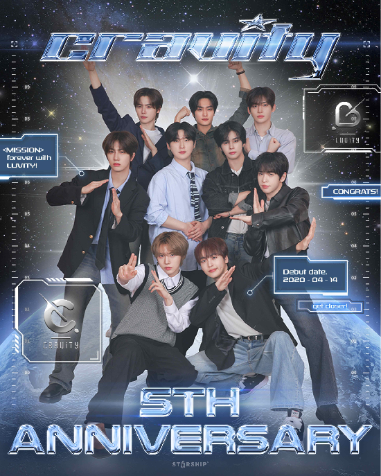 스타쉽엔터테인먼트그룹크래비티(CRAVITY:세림.앨런.정모.우빈.원진.민희.형준.태영.성민)가데뷔5주년을맞이했다.소속사스타쉽엔터테인먼트는오늘(14일)크래비티의공식SNS채널을통해데뷔5주년기념축전이미지를공개했다.사진속에는하나의행성을지키는듯한크래비티멤버들과함께‘러비티(공식팬클럽명)와영원히함께하기(foreverwithLUVITY!)’라는미션이적혀있어크래비티의세계관과5주년의의미를더했다.2020년4월14일가요계에나선크래비티는데뷔후각종시상식에서신인상을석권하며그존재감을알렸다.이후정규1집파트2‘리버티:인아워코스모스(LIBERTY:INOURCOSMOS)’부터청춘서사를중심으로미니4집‘뉴웨이브(NEWWAVE)’,미니5집‘마스터:피스(MASTER:PIECE)’,미니6집‘선시커(SUNSEEKER)’,미니7집‘에버샤인(EVERSHINE)’을통해꾸준히독창적인콘셉트와그들만의청량한라이브,퍼포먼스를선보이며‘보컬비티’,‘퍼포비티’의수식어를모두거머쥐었고,그룹의정체성을구축하는동시에계단형성장을이어왔다.끊임없는성장속에서도이들은도전을멈추지않았다.크래비티는지난해Mnet‘로드투킹덤:ACEOFACE’에출연해매회뛰어난실력은물론,무한한잠재력을드러내며3연속누적팀랭킹1위를차지,파이널무대에서총점20만점을기록하며압도적인점수로‘최종우승’이라는결실을맺었다.이후지난해12월발매한싱글앨범‘파인드디오르빗(FINDTHEORBIT)’을통해거침없이도전하는청춘과크래비티만의서사를그리며한층더깊어진음악적역량과압도적인퍼포먼스를보여줬다.크래비티는해당앨범으로자체최고초동판매량을기록하며커리어하이를달성한것은물론,국내외음원및음반차트에이름을올리며글로벌인기를굳혔고,‘2024슈퍼사운드페스티벌(2024SUPERSOUNDFESTIVAL)’에서퍼포먼스남자그룹부문을수상하며‘퍼포비티’의명성을이었다.크래비티의지칠줄모르는질주는국내를넘어글로벌무대로이어졌다.크래비티는지난해9월부터이어진글로벌팬콘투어‘비욘드유어메모리즈’(CRAVITYFAN-CON‘BEYONDYOURMEMORIES’)를통해다채로운퍼포먼스와완성도높은무대를선사했고,크래비티특유의청량한에너지를글로벌K팝시장에각인시켰다.이에힘입어지난달26일발매한크래비티일본두번째미니앨범‘젤리빈(JellyBean)’은오리콘주간앨범랭킹8위와타워레코드전점종합앨범차트3위에오르는등뜨거운글로벌인기를자랑했다.크래비티는본업인음악활동뿐만아니라각종방송과콘텐츠에서도꾸준한활약을보여줬다.공식SNS를통한자체콘텐츠,커버영상,브이로그등으로뛰어난예능감과팀의케미스트리를보여줬고,특히크래비티의자체콘텐츠‘비티파크’는데뷔때부터다양한주제로꾸려지며올해100회를맞이,‘K팝대표장수콘텐츠’로거듭났다.이뿐만아니라MBC‘복면가왕’,KBS2‘불후의명곡’등각종예능을통해실력을발휘한것은물론,음악방송과토크쇼MC,예능고정출연등으로개인활약도활발하게보여주며다방면에서크래비티의존재감을드러내고있다.■이하크래비티의데뷔5주년기념일문일답전문Q.5주년을맞이한소감이어떤가세림:벌써5주년이라는게실감이잘안나는데,모든과정이러비티와함께여서가능했고,고맙고사랑한다는말전하고싶다.또,다같이힘내준멤버들한테도너무고맙다.앨런:그동안다양한음악과무대로크래비티를보여줄수있어서너무행복했다.앞으로도최선을다해서더많은무대에서우리의열정과잠재력을보여주고싶다.정모:데뷔무대가아직도생생한데5주년이라니감회가새롭다.새로운활동을준비할때마다‘어떻게하면크래비티를더잘보여줄수있을까’고민했는데,그과정에서자연스럽게우리의색깔과정체성을찾은것같아뿌듯하다.우빈:먼상상속에만있던5주년이었는데,이렇게빨리올줄몰랐다.그만큼다같이열심히잘해온것같아더욱뿌듯하다.앞으로도크래비티만의노래와무대로많은분들께보답하고싶다.원진:그동안멤버들이랑정말열심히,최선을다하자는마음으로달린것같은데벌써5주년이라니벅차다.무엇보다좋은노래와무대를통해러비티와많은추억을쌓은것같아뿌듯하고,앞으로도좋은모습많이보여주고싶다.민희:크래비티의5주년이라는시간을함께해준모든분들과멤버들,무엇보다우리러비티너무고맙고,작년에유독도전과성취가많았어서이번5주년이더욱기쁘고값진것같다.앞으로도좋은모습많이보여드릴테니기대해주셨으면좋겠다.형준:5주년이라는소중한날을러비티와함께축하할수있어서너무기쁘다.특히,작년경연과투어이후로더단단해진크래비티가너무자랑스럽고앞으로가더기대된다.모두건강하게열심히활동했으면좋겠다.태영:데뷔5주년을맞다니꿈같다.그동안많은것을이룬멤버들이너무자랑스럽고,앞으로도행복한추억쌓으면서좋은음악으로크래비티를알리고싶다.성민:5주년이라는숫자가믿기지않을정도로시간이빠르게갔는데,앞으로도더열심히해서크래비티가계속‘기대되는팀’이되었으면좋겠다.모든순간을함께해준러비티에게도너무고맙다.Q.가장기억에남는순간을꼽자면앨런:작년에‘러브오어다이’로음악방송에서1위를했던순간이떠오른다.당시에앨범을준비하면서활동목표를음악방송1위로정했었는데,그목표를이루고현장에서러비티들과기쁨을나눈게잊히지않