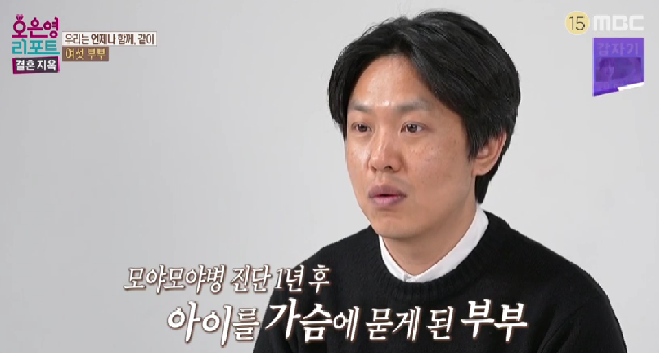 (엑스포츠뉴스이유림기자)'여섯부부'남편이모야모야병으로셋째를떠나보냈다고밝혔다.7일방송된'오은영리포트–결혼지옥'에는‘우리가족은영원히여섯명’이라는마음으로살아가고있는'여섯부부'의남편이결혼지옥최초로남편단독상담을신청해오은영박사를찾았다.이날남편은“아내와연애8개월만에한번헤어졌었다”고고백하며,이후20대중반에다시재회해1년간의연애끝에결혼했다고밝혔다.그렇게결혼17년차에접어들었으나,일상을담은영상에서는아내의모습이전혀보이지않았다.그는사건이발생했다며"(삶이)정상적일수없다.왜나한테이런일이일어난지모르겠다"고깊은지침을드러냈다.아이들역시웃음을잃고무기력한모습을보였고,특히첫째아들은"살고싶지않다"고말해충격을안겼다.남편은'결혼지옥'역사상최초로스튜디오에홀로등장했다.박지민이"아내분은나오시기힘든사정이있냐"고물었고,남편은"여러사정이있어서못나오게됐다"고답했다.사연신청이유에대해그는"(오은영)박사님나오시는방송을우연히보게됐다.얘기해주시는걸봤는데'저분이면도움을받을수있지않을까'싶었다"며"지금도사실(제마음을)모르겠다"고털어놓았다.남편은이어,셋째아이가3살이던2016년에뇌출혈로세상을떠난안타까운사연을전했다.그는"아이가3살때어린이집에서좀이상하다고하는거다.증상이있어서병원에갔더니‘모야모야병’이라는진단을받았죠”라며당시를회상했다.모야모야병은특별한외상없이뇌속혈관이막히는만성진행성뇌혈관질환이다.이후큰병원으로옮겨두차례의뇌수술을받았지만,진단을받은지1년만에아이는끝내부모의품을떠났다.아침부터수준급요리실력을뽐내던남편은,하늘로떠난셋째아이의봉안당에가기위해아이가좋아했던음식들을정성스럽게만들었다."엄마한테인사하자"며가족들을방으로이끈남편.그방안에는병상에누워있는아내가있었다.남편은"태양이가(하늘로)떠나고유전적요인이있으니까(병원에서)가족들다검사해보라고해서했는데아내가모야모야병이있더라"고밝혔다.이어"명절때부산에내려갔는데처형한테처음에전화가왔다.아내가아팠던적이있냐고(묻길래)무슨소리냐고하니까(아내가)쓰러져서응급실로가고있다더라"며당시를떠올렸다.현재아내는뇌출혈로인한뇌손상으로식물인간상태에놓여있다고밝혀안타까움을자아냈다.사진=MBC방송화면이유림기자[email protected]©엑스포츠뉴스.무단전재및재배포금지.
