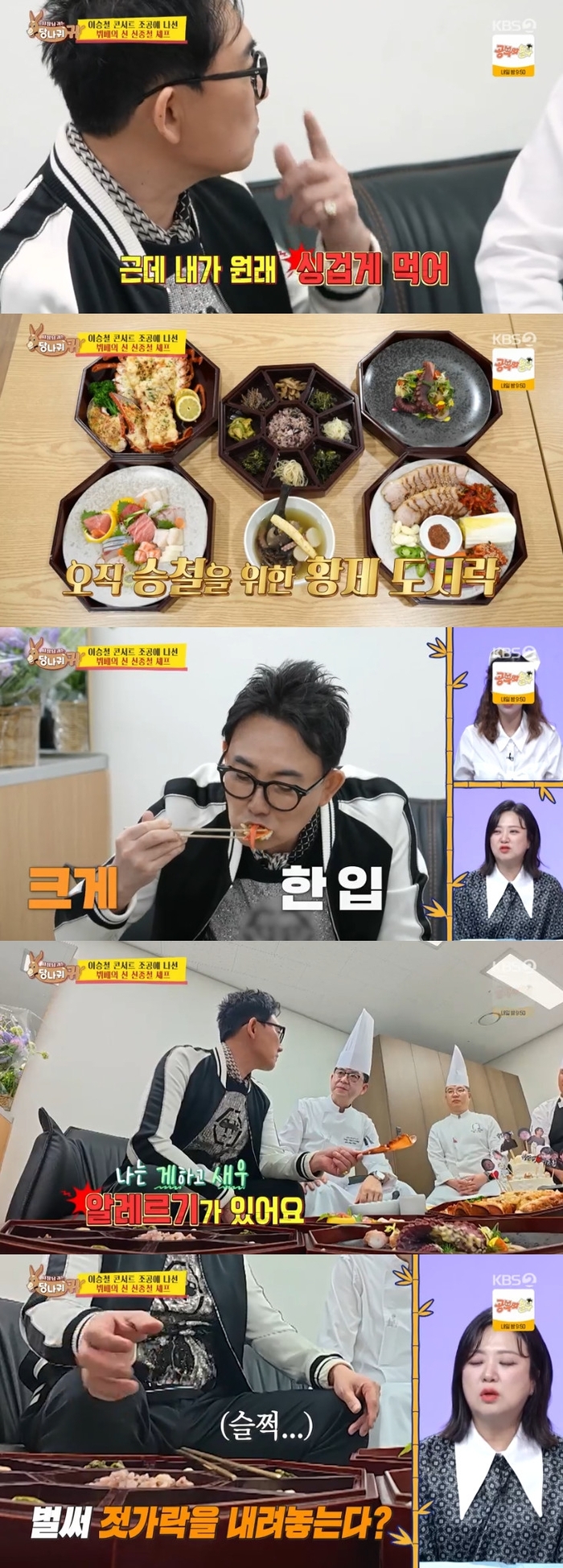 ‘사당귀’.사진lKBS엄지인이KBS아나운서최초로팬미팅을진행했다.6일오후방송된KBS2예능프로그램‘사장님귀는당나귀귀’(이하‘사당귀’)에는이순실,신종철,엄지인보스가모습을보였다.이날방송에는첫번째보스로이순실이등장했다.그는직접머리카락을자른후두피를헹궜다.특이하게주방세제로머리를감던그는“이걸로감아야뽀드득잘씻겨.자기도이제샴푸랑린스말로주방세제로머리감아”라며남편에게권했다.그러나최근계속해서빠지는머리카락에스트레스를받는다는순실은“예전에는머리카락숱이많아서고민이었는데지금은너무많이빠져서이틀에한번씩감아요”라며탈모를고백했다.남편은“나머리빠졌다고약올리더니.이때는머리도많고예뻤구먼.세월이지나면그럴수도있지”라며순실을다독였으나순실은“내가밥해줘야하고빨래도해야하고그러니까머리가다빠지는거야.남들은부인이욕하면삐쳐서나간다는데왜나가질않아요.나같으면화나서나가겠다”라며남편을향해무자비한폭언을했다.결국두사람은가발전문가에게갔다.순실은“부분가발은얼마나할까요?”라고질문,전문가는“부분가발은50만원이고요.크게는1백만원까지합니다.반가발을추천하고싶습니다”라고설명했다.남편은“남자가발은어떻게?”라고물었지만순실은“무슨가발을해?”라며어이없어하기도.순실은어떤가발을쓰고싶냐는질문에“장원영머리하고싶어요”라며생머리가발을가리켰다.긴머리가발을쓴순실의모습을본박명수는“월매아니야?”라며폭소했다.남편은“증명사진,여권사진찍어야겠다”라며눈치를봤고순실은“빨리찍어!”라며호통쳤다.그러나신지와엄지인은“잘어울리는데요?”라며긴머리순실을보고감탄하기도했다.이후에도두사람은단발머리,갈색머리등의가발을착용하며사리사욕을채웠다.두번째보스로는신종철셰프가모습을보였다.신종철은“오늘은제절친형님인이승철형님이전국투어첫공연날이라서응원차도시락을준비했습니다.요즘인기인맞춤형도시락인데특별히황제도시락을조공할예정입니다.이건다른호텔에선하지않는새로운아이템이기때문에이를계기로계약까지하려고합니다.공연업계는제가다휘어잡을수있습니다”라며이승철콘서트를찾은이유를밝혔다.그는연어구이,갈비찜등스태프도시락까지준비하고이승철만을위한5단도시락을만들었다.이후이승철의대기실에방문,직원들과함께‘소녀시대’등이승철노래를열창했다.도시락을연이승철은“이건또뭐야?대단하다...가수생활하면서나이런건처음보는데?”라며감격했다.그는“일단국물먼저!”라며팔도장을음미,“짜다!근데내가원래싱겁게먹어”라며거침없이독설을내뱉었다.다음으로랍스터까지체크,“나는게하고새우알레르기가있어요.평생꽃게를못먹는다는생각에열받아서계속먹으니까되더라고.공연때는물밖에안먹어”라며젓가락을내려놓았다.이에신종철은직접문어를손질했다.그는“제마음은중국황제를위한만한전석을준비하고싶은데이렇게준비해봤습니다”라며달콤한말을내뱉었다.감동한이승철은“맛있다!허리가안좋았는데이거먹으니까괜찮네!이경실선배랑선우용녀선배님이갔던데...”라며신종철의돌싱을언급했다.신종철은“연봉은괜찮아요.집있고차도있고돈도많고건물도있습니다.상가도있습니다”라며자기어필을했다.그러나이승철은“재미는없는스타일이야.여자들이줄서지않을까?일단음식을먹어!나도요리가늘기시작한게작업용이었거든.라면에전복넣어주니감동하더라고!모든여성은요섹남을좋아한다는것을”이라며팁을전수했다.신종철은“40주년기념으로저한테또기회를주시면열심히해보겠습니다.공연도시락은저희가쭉?”이라며구애했지만이승철은“도시락잘먹었습니다!”라며급하게자리를마무리했다.‘사당귀’.사진lKBS세번째보스로는엄지인아나운서가모습을보였다.그는후배아나운서들에게“원래너희랑카페가서얘기하려고했는데요즘알아보시는분들이너무많아.내가KBS대표아나운서잖아.내얼굴이곧KBS의얼굴이니까시청자에게보답하고자내첫팬미팅을해보고자해”라며본심을드러냈다.이를보던김숙은“집에진짜안들어가죠?”라며KBS지박령엄지인에게물었다.이에엄지인은“제가봐도집에잘안들어가는것같아요.아이들이일본에있어요.남편이랑아들,딸이다일본에있어서제가기러기엄마가됐어요”라고고백했다.전현무가“혼인상태유지되고있는거죠?”라고묻자박명수는“혼수상태”라고받아쳐웃음을자아냈다.그는“KBS아나운서실에서팬미팅은처음일걸요?전현무선배도못했어요.저만큼인기있는친구는없으니까”라며인터뷰에서속마음을고백했다.엄지인은“너희가도와줘야해.내일할생각인데게릴라팬미팅으로한500명정도오지않을까?”라며도움을요청했다.김진웅은“저도요즘에팬이생겼어요.홈마팬이라고하잖아요?그리고밸런타인데이때는간식도주시고최근에는헬스장에서운동하고나왔는데저를알아보시더라고요”라며은근슬쩍자랑했다.이후엄지인은인지도테스트를위해김진웅,홍주연과함께망원시장으로향했다.엄지인을알아본상인들은“아침방송하시잖아요?”,“실례가안된다면제가호떡사드리겠습