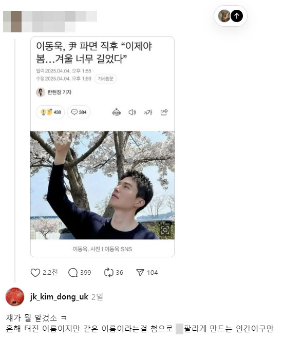 사진스레드캡처윤석열전대통령을지지해온가수JK김동욱이배우이동욱을공개저격했다.지난4일JK김동욱은이동욱의기사를캡처한SNS게시글에"쟤가뭘알겠소.흔해터진이름이지만같은이름이라는걸처음으로X팔리게하는인간이구먼"이라는댓글을남겼다.해당기사는이동욱이윤전대통령의파면직후팬소통플랫폼버블을통해"아휴이제야봄이네.겨울이너무길었다"고말한내용을다뤘다.그가윤전대통령파면을직접언급하진않았으나탄핵인용직후이같은메시지를전해눈길을끌었다.앞서헌법재판소는4일오전11시22분서울종로구헌재대심판정에서윤전대통령을재판관전원일치의견으로파면했다.이같은결정에그간윤전대통령을공개적으로지지해온JK김동욱은같은날"2060년이대한민국붕괴하는해가될것이라는영상들이보일때마다설마설마했지만그렇게빨리?아니그전에변할것이야나름희망찬주문을걸었었다"며"이제생각이바뀌었다.전세계가예상하는것보다더빨리망할수있겠다는생각이지배적"이라는글을적었다.이어"우리2030들!이번탄핵반대반국가세력저지를위해열심히싸운거에박수와갈채를보낸다"면서"사실희망보단절망적인시기에도달하게된현실이지만무엇이나를뜨겁게만들었고무엇이나를살게하는가에대한질문을끝없이던져야할것같다"고덧붙였다.한편JK김동욱은고등학생시절캐나다에이민을가현지시민권을취득한한국계캐나다인가수로알려졌다.현예슬기자[email protected]©중앙일보.무단전재및재배포금지.
