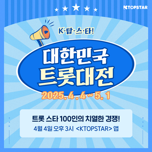 K탑스타가‘대한민국트롯대전’투표를열고4주간의서바이벌대장정을시작한다.국내트롯팬들의뜨거운응원이모이는특별한투표이벤트‘K탑스타대한민국트롯대전’이4월4일오후3시부터공식투표를시작한다.총100명의인기트롯스타들이참여하는이번행사는,4주간의팬투표를통해국민이직접최종1인을선정하는서바이벌방식으로진행된다.투표종료는5월1일오후3시이며,기간중매주한차례씩총4라운드로나뉘어투표가이뤄진다.K탑스타가‘대한민국트롯대전’투표를열고4주간의서바이벌대장정을시작한다.사진=K탑스타4주간의팬투표…최종1위트롯스타는누구?이번투표에는남자트롯스타50인,여자트롯스타50인등총100명이후보로참여한다.후보에는송가인,홍진영,임영웅,김호중,영탁,이찬원,정동원,장민호,김희재,안성훈,박지현,진해성,박서진,홍지윤,손태진,양지원,황영웅,에녹,김용빈등이있다.4월4일시작되는1라운드에서는하위50명이탈락하며,이후라운드마다점차후보가줄어들고최종결승전에오른TOP10중1위를팬투표로결정하게된다.K탑스타가‘대한민국트롯대전’투표를열고4주간의서바이벌대장정을시작한다.사진=K탑스타최종1위로선정된최고트롯스타에게는뉴욕타임스퀘어전광판광고가제공된다.투표는K탑스타공식앱에서누구나참여가능하며,K탑스타공식앱과공식블로그를통해중간순위및라운드결과가실시간으로공개된다.[손진아MK스포츠기자][ⓒMK스포츠,무단전재및재배포금지]Copyright©MK스포츠.무단전재및재배포금지.