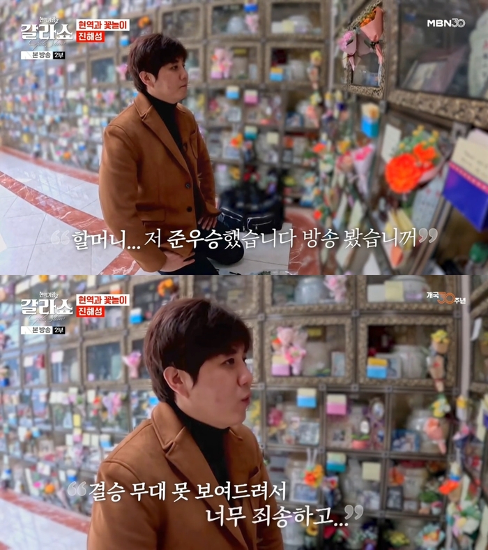 현역가왕2.사진|MBN[스포츠서울|박경호기자]가수진해성이돌아가신할머니를그리워했다.4일방송된MBN‘현역가왕2갈라쇼’에서는TOP10스페셜무대와비하인드가공개됐다.이날방송에서진해성은비하인드영상을통해“하늘에계신할머니,결승무대는못보셨지만좋은성적얻었습니다.감사합니다”라고말하며눈물을흘렸다.현역가왕2사진|MBN진해성은결승전이끝난후할머니가계신납골당을찾았다.진해성은“이정도면성공한것아닙니까.할머니덕분에준우승했다생각하고더열심히하겠습니다.몇주전만해도이야기하면대답을했는데,이제대답소리도못듣네.할머니미안합니다”라고말하며눈물을흘렸다.한편,‘현역가왕2’참가자들은오는4월부터전국투어콘서트를개최한다[email protected]©스포츠서울.무단전재및재배포금지.