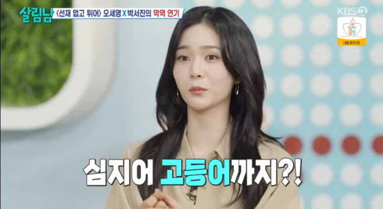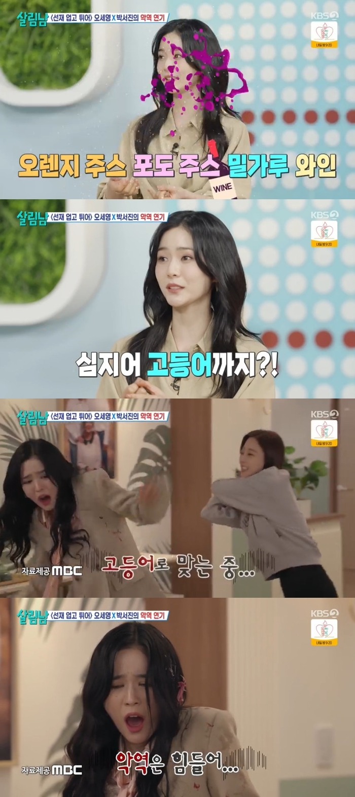 KBS2TV'살림하는남자들시즌2'1일방송KBS2TV'살림하는남자들시즌2'(서울=뉴스1)김보기자=배우오세영이악역배역을맡는고충을털어놨다.1일오후방송된KBS2TV'살림하는남자들시즌2'에는오세영이스페셜게스트로출연해재미를더했다.오세영은드라마'세번째결혼'과'선재업고튀어'에연이어악역을맡으며얼굴을알렸다.이에백지영이"몸싸움신도많이있었다던데"라고묻자오세영은"제가악역인데도불구하고갖은음식들로맞았다"라고대답했다.무슨말이냐고묻자오세영은"색깔별로맞았다,오렌지주스,포도주스,밀가루,와인"이라고말하더니"고등어로도맞아봤다"라고덧붙여MC들을놀라게했다.은지원은박서진을향해"동생박효정에게는항상악역을자처한다"라고소개하며두사람이함께'가을동화'의명장면을재연해보라고요청했다.이에오세영은다소어설픈박서진의연기에도한순간몰입하더니훌륭히연기를해냈다.백지영은"악역이라길래표독스럽게할줄알았더니되게무시한다"라며오세영의현실감넘치는연기를칭찬했다[email protected]©뉴스1.Allrightsreserved.무단전재및재배포,AI학습이용금지.