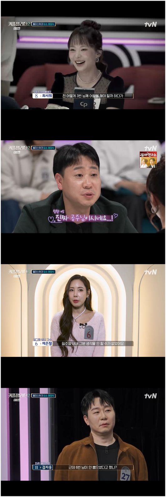 [OSEN=오세진기자]‘커플팰리스2’유명인출연자들인회사원A와클레오채은정의선택이갈렸다.26일방영한tvN‘커플팰리스2’에서는팰리스위크로떠나는커플매칭이시작되었다.인상좋은미남인남자3번에게적극적인어필을하던회사원A최서희는자신에게관심을보였던남자28번간호학과조교수를선택해모두를깜짝놀라게만들었다.그는“남자28번은눈에서하트를쏴주셔서,기억에남는다.너무너무재미있는대화를했다.약간좋은느낌?”라며28번을고른이유를밝혔다.한편Y대출신치과의사27번남자최영준과오묘한썸느낌을뽐내던클레오채은정은최영준이패스트1대1데이트때자신에게오지않은것에크게실망했다.채은정은“모든여자들중에저만혼자앉아있었다.정말지옥같은시간이었고,비참했다”라고말했다.그러나27번남자최영준은“저는원픽이채은정이었는데,저를고르지않았다.서운하기보다는당황했다”라고말했다.그럼에도27번남자는채은정과팰리스위크를가길원했다.그러나채은정은거절했다.채은정은“모든게꼬인거같다.제가남자3명을고를때,줄을서는건데도안오고,혼자앉아있었던시간이너무서러웠다.그래서마음이서러웠다.이런사소한것들이모여서빗나갈수있나보다싶었다”라며소갠를털어놓았다./[email protected][사진]tvN‘커플팰리스2’Copyright©OSEN.무단전재및재배포금지.
