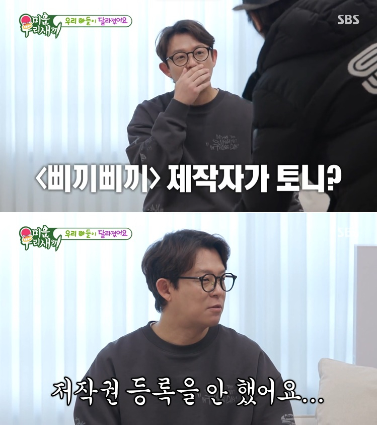 /사진=SBS'미운우리새끼'가수토니안(47)이챌린지음악'삐끼삐끼'의원곡자라고밝히며저작권수입을공개했다.23일방송된SBS'미운우리새끼'에서는토니안이3년만에출연해근황을전했다.이상민은깨끗해진토니안의집을보며"무슨일있었냐"고놀라워했다.토니안은"재덕이랑17년정도같이살았다"며"이제재덕이가가서혼자산다"고밝혔다.토니안은지난해챌린지음악으로인기를얻은'삐끼삐끼'의작사와작곡,편곡을했다고밝혔다.토니안은"조회수가8000만회정도나왔다"고자랑했고,김희철은"10원씩만해도8억원"이라며놀랐다./사진=SBS'미운우리새끼'그러나토니안은저작권등록하지않았다고.그는"한창뜰때한푼도벌지못했다"며"20년전에쓴거다.예전회사에서깜빡한것같다.잘될지도몰랐다.그렇게존재감있는곡도아니었다"고설명했다.토니안은뒤늦게저작권협회를찾아가'삐끼삐끼'가본인곡이라고밝힌뒤등록했다고덧붙였다.그는"거기있던분들이깜짝놀라더라.다들기사를찾아보더니'진짜맞네요?'라고했다"고말했다.토니안은저작권등록한지3개월이됐다며"지금까지번돈은대형차핸들하나살수있을정도인26만원"이라고밝혀씁쓸함을안겼다.류원혜기자[email protected]©머니투데이&mt.co.kr.무단전재및재배포,AI학습이용금지